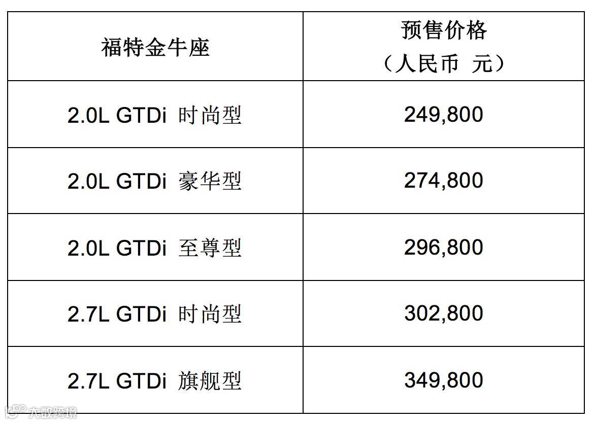 长安福特旗舰车型福特金牛座正式启动预售!作为一款“尊崇科技商务座驾”,福特金牛座搭载了同级独有的后排座椅倾角电动调节、E-Shifter旋钮式电子换挡器、后排气囊安全带等众多前瞻性的创新科技配置,更拥有缔造同级最强劲动力的2.7L EcoBoost® GTDi 双涡轮增压V6发动机,此次率先推出5款车型供消费者选择,预售价格区间为249,800元至349,800元。