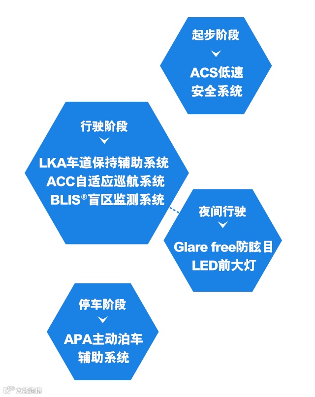 夜晚行驶,保证自己视线良好,也要考虑他人的安全。Glare free防眩目LED前大灯,当车速高于40km/h时,智能调整远光灯光型,对来车形成一个防眩目区域。