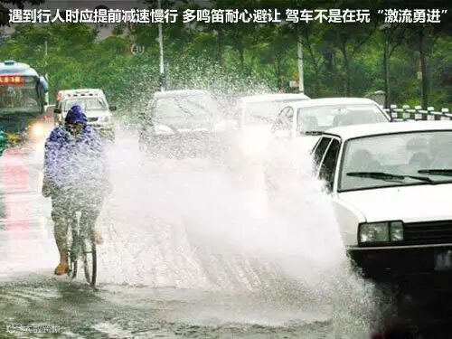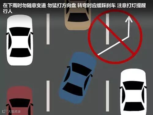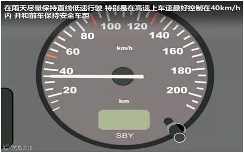 在雨天尽量保持直线低速行驶,特别是在高速上,车速最好控制在40km/h内,并和前车保持安全车距,勿跟大货车。更需要注意路边的行人,应减速慢行多鸣笛,耐心避让,切不可与行人或非机动车抢道。勿随意变道,勿猛打方向盘,转弯时应缓踩刹车,注意打灯提醒行人。如果需要停车,尽量提前100米左右减速、缓踩刹车。