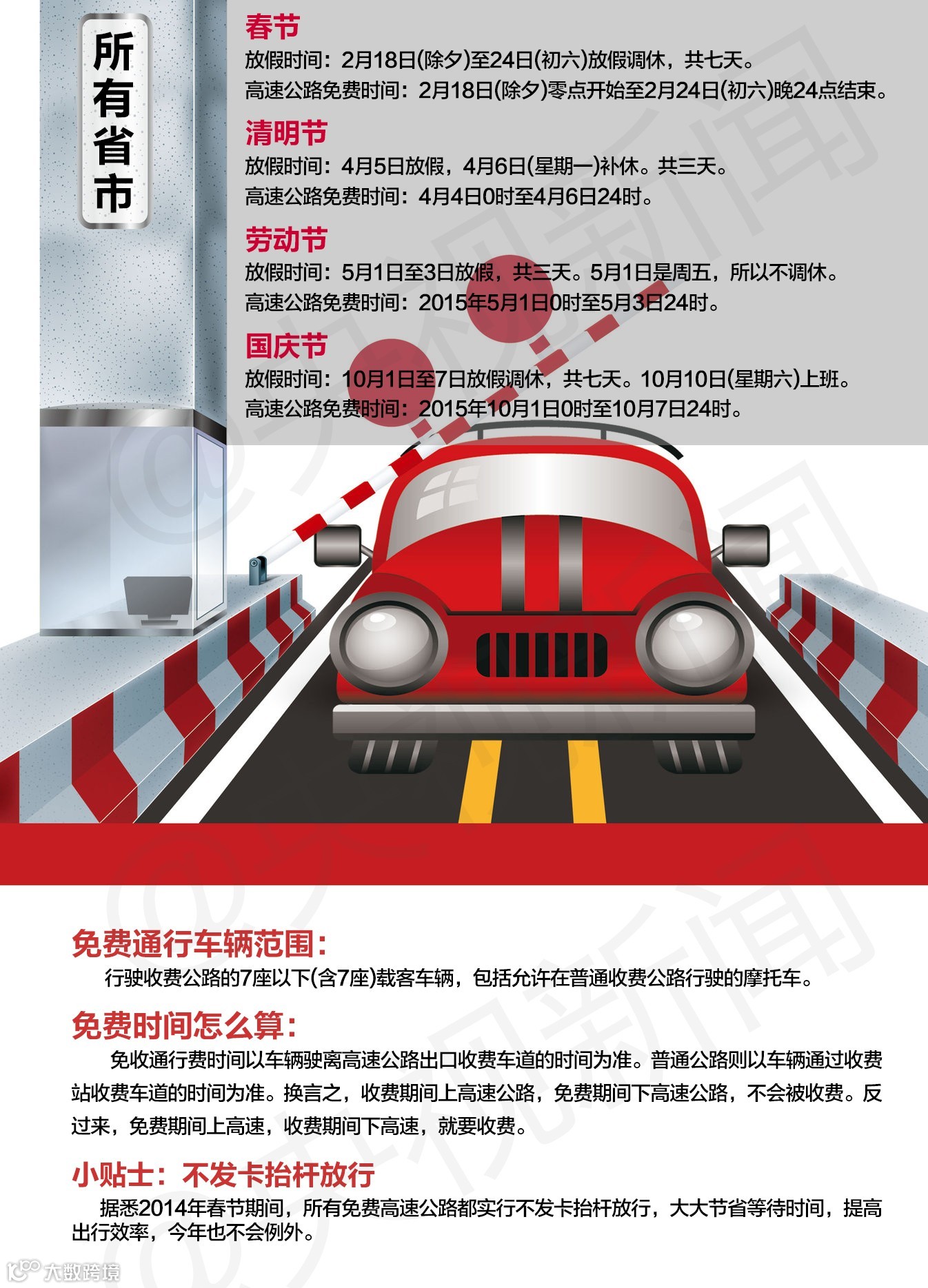 春节还有不到一个月的时间就来了,无论是回家团聚还是外出旅行,高速公路的免费情况都成为大家关注的焦点。2015年春节高速公路免费时间具体从哪天开始?持续多长时间?哪些车型可以免费通行?赶紧收藏吧!