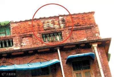 这座旧民居的顶部在抗战时期被炸弹炸烂了一小部分,后来用其他砖补上了。