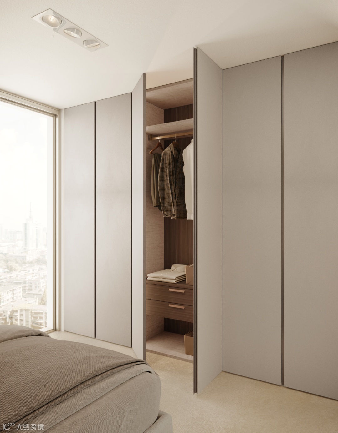 整个卧室空间配备了两款落地衣柜,其中一款的外部都用了深色胡桃木纹PoroNoceLS80,而同款花色也巧妙地应用在了另一款纯色衣柜的内部抽屉与背板上,与第一款衣柜形成了呼应。