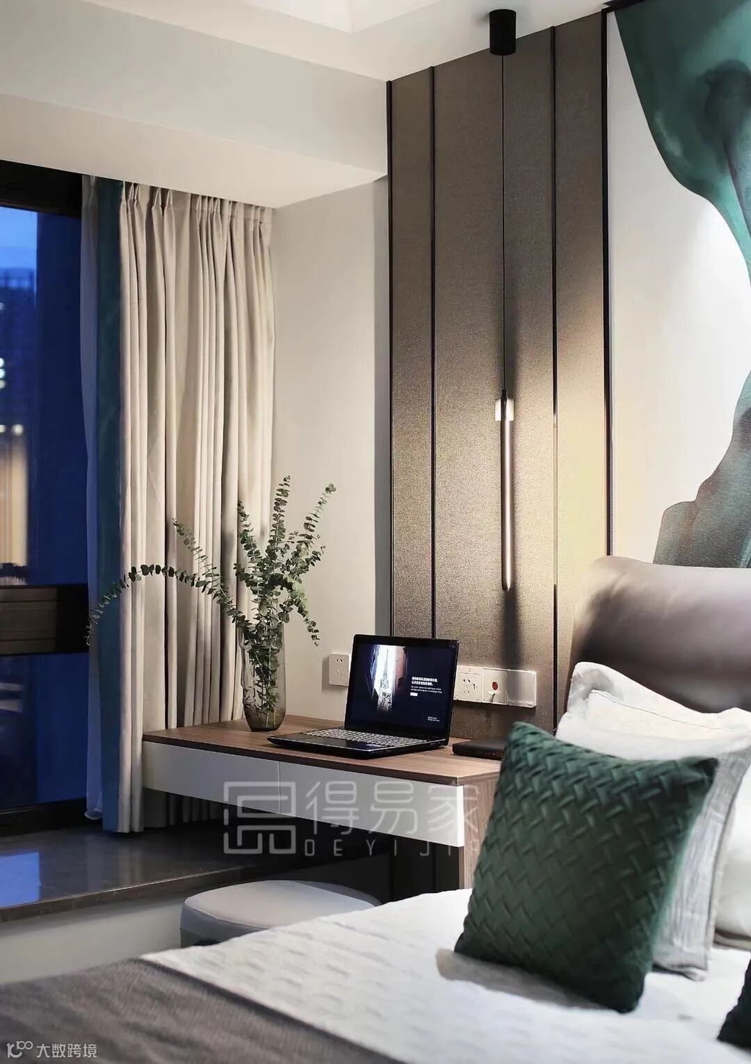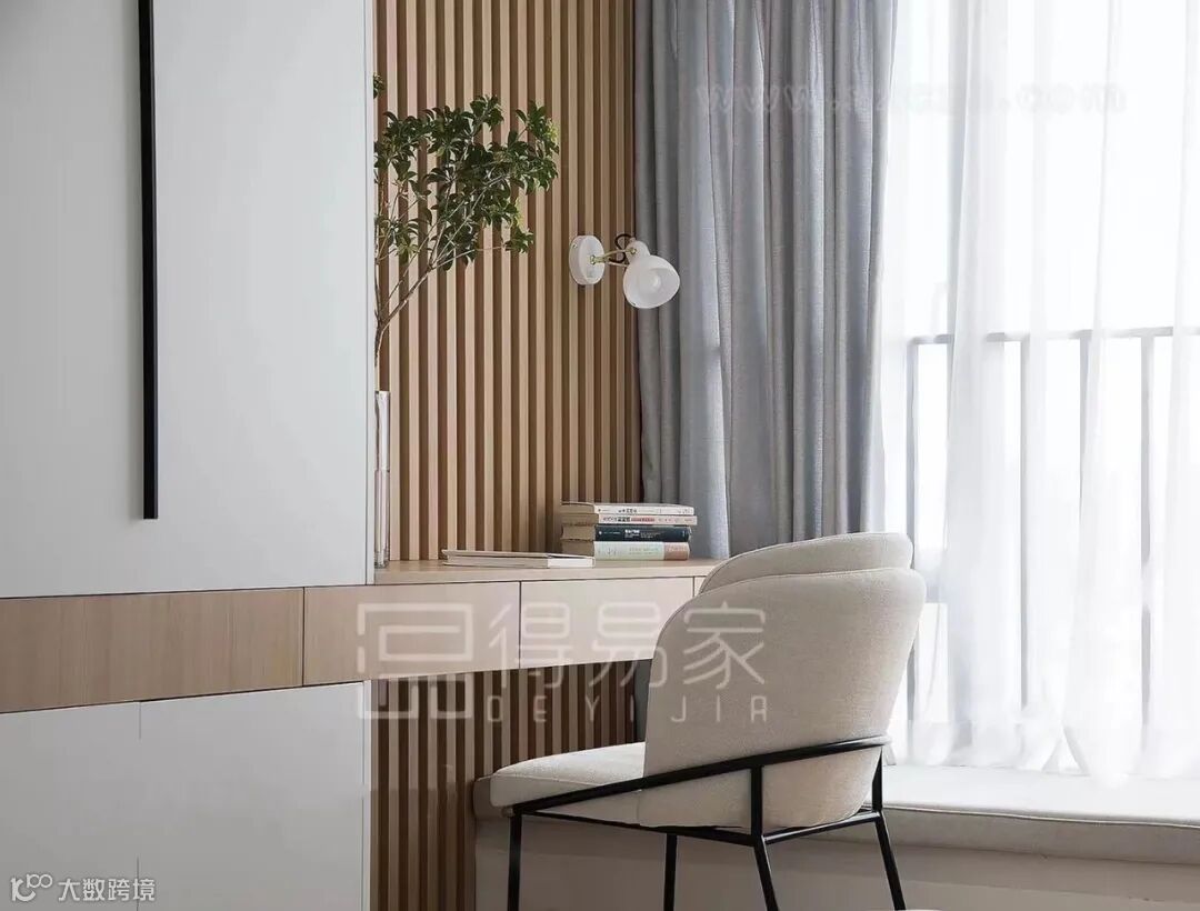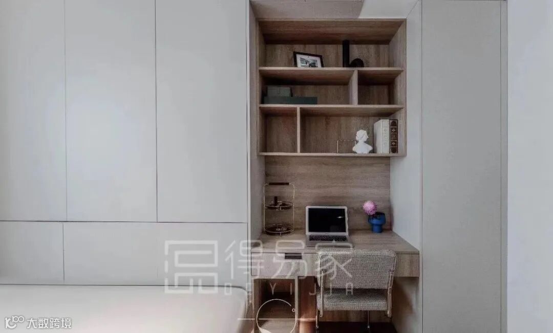 从衣柜延伸出来的书桌,与床头背景的木纹花色相呼应,可以做为阅读角,也可以做为梳妆区。