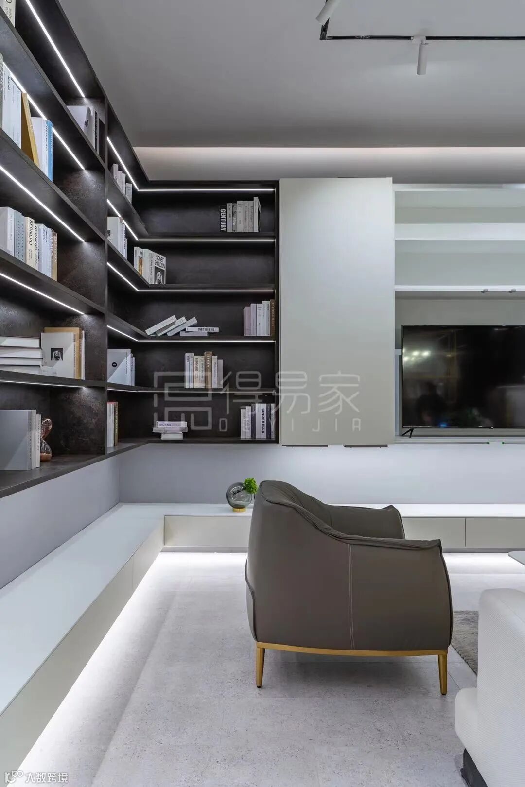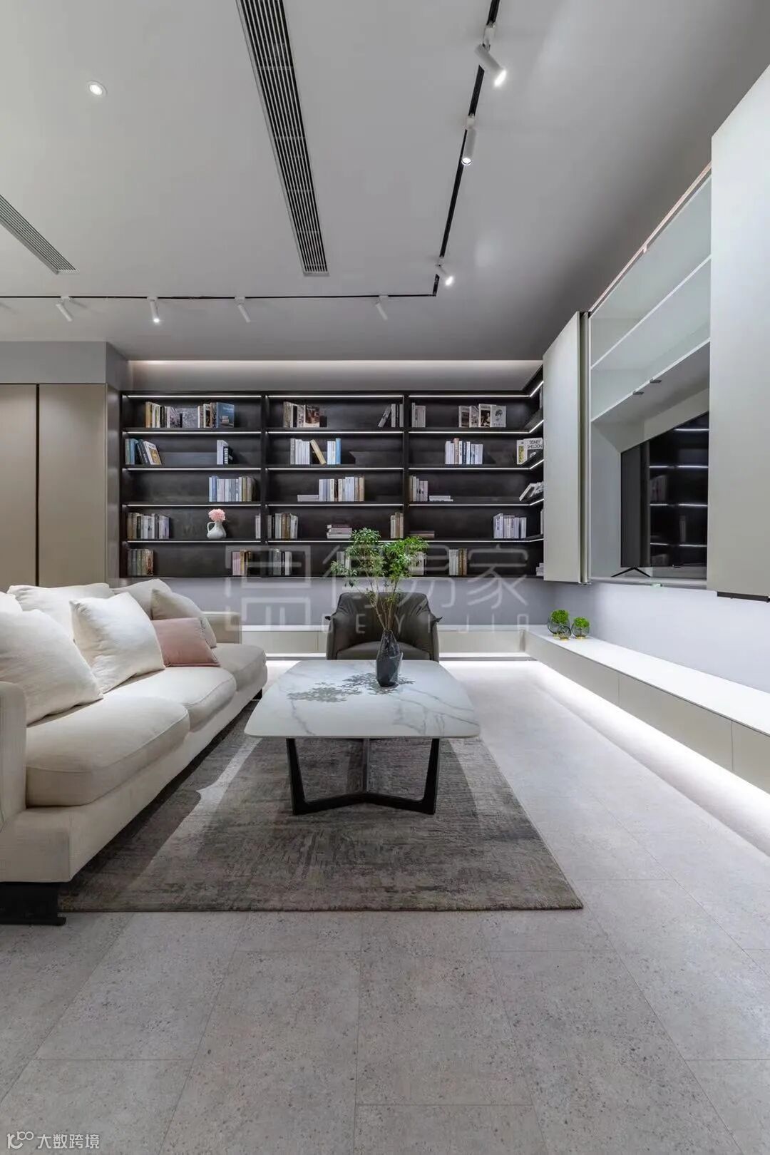 这套是华润府二期的实例,客厅的视觉中心通过定制柜满足实用与美观的需求,开放的展示柜与电视下面悬空的柜体选择了带有凹凸纹理的F311 ST87碳黑陶瓷色,结合灯光的设计,彰显质感与品位。