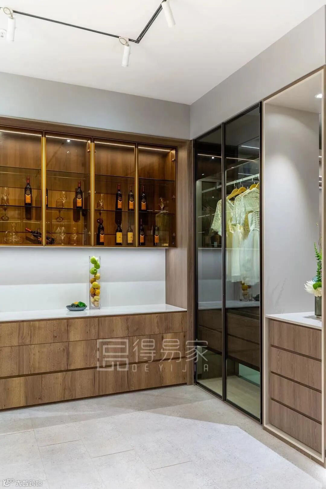 这个区域展示的衣橱和酒柜吧台的设计,木色与白色为主色,结合玻璃与灯光的设计,给人一种自然温馨且高级精致的感觉。
