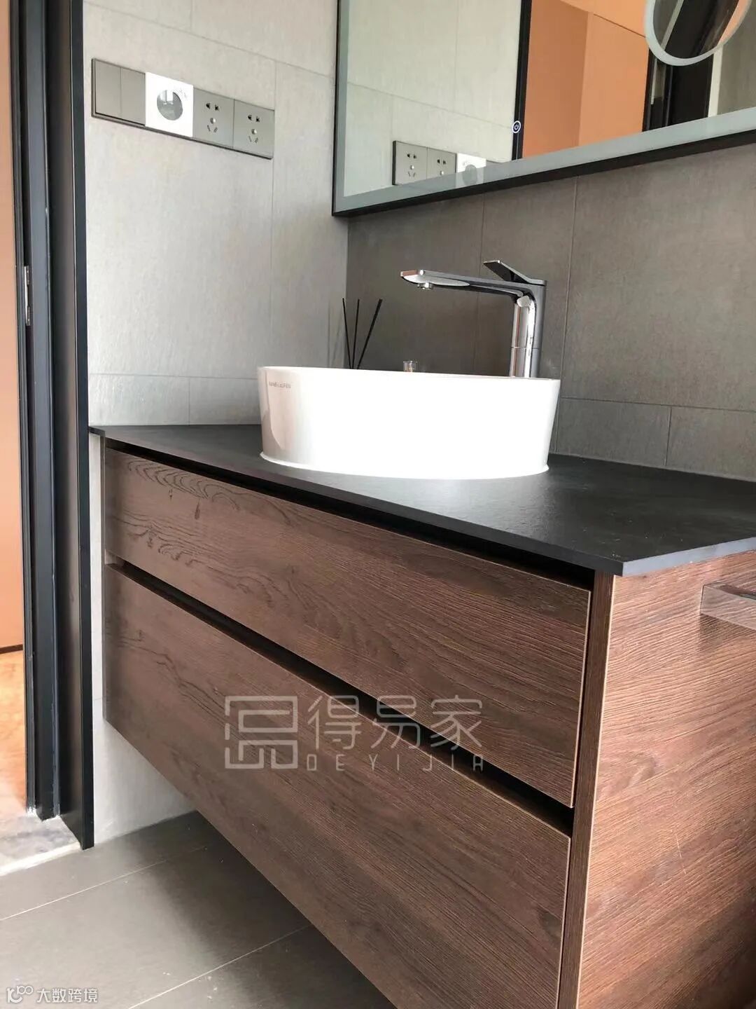 爱格板具有防水防潮的功能,在潮湿的卫浴空间也可以运用自如,卫浴柜采用H3325 ST28烟草色格莱斯顿橡木,与灰黑色的搭配,优雅高级。