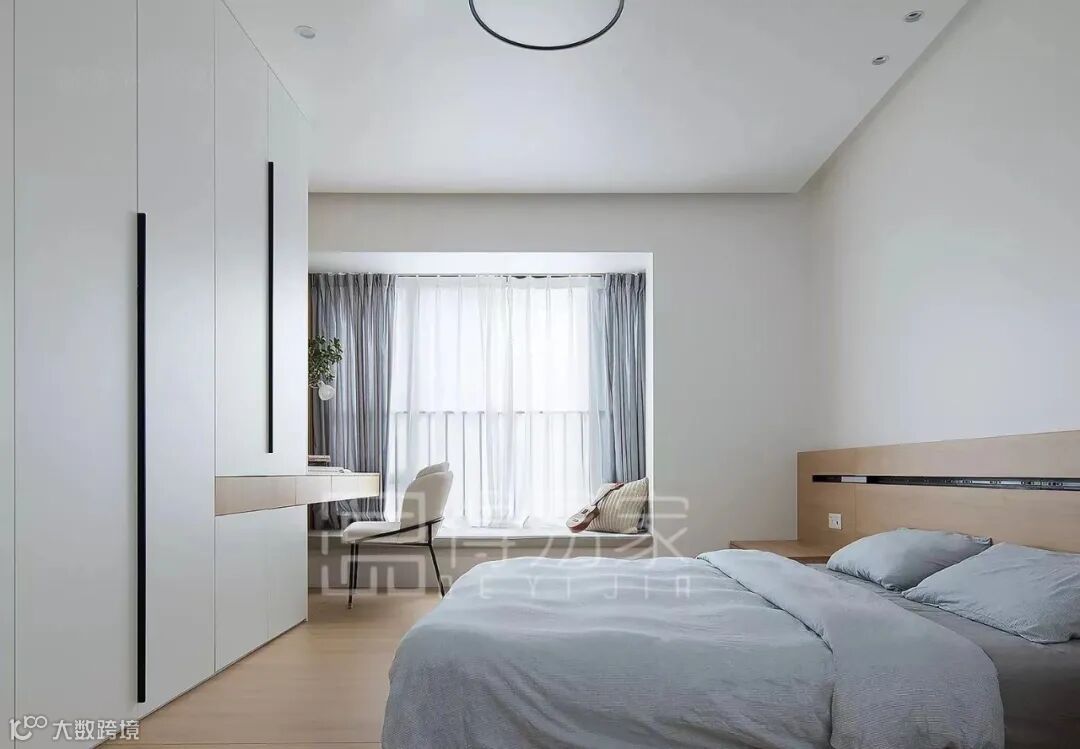 卧室没有太强列的色彩,给人的感觉是优雅舒缓的,更能让屋主获得身心的放松。床侧的优雅木纹饰面+玻璃门的现代风衣橱,满足实用性的同时,不会影响空间的通透感。床头柜运用自然木纹色搭配白色,营造出自然温馨睡前氛围。