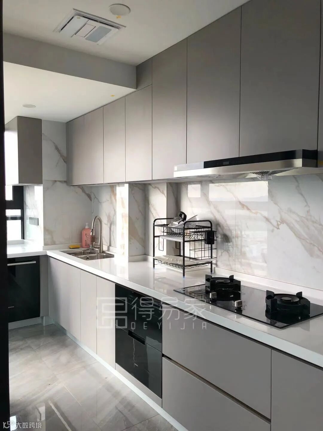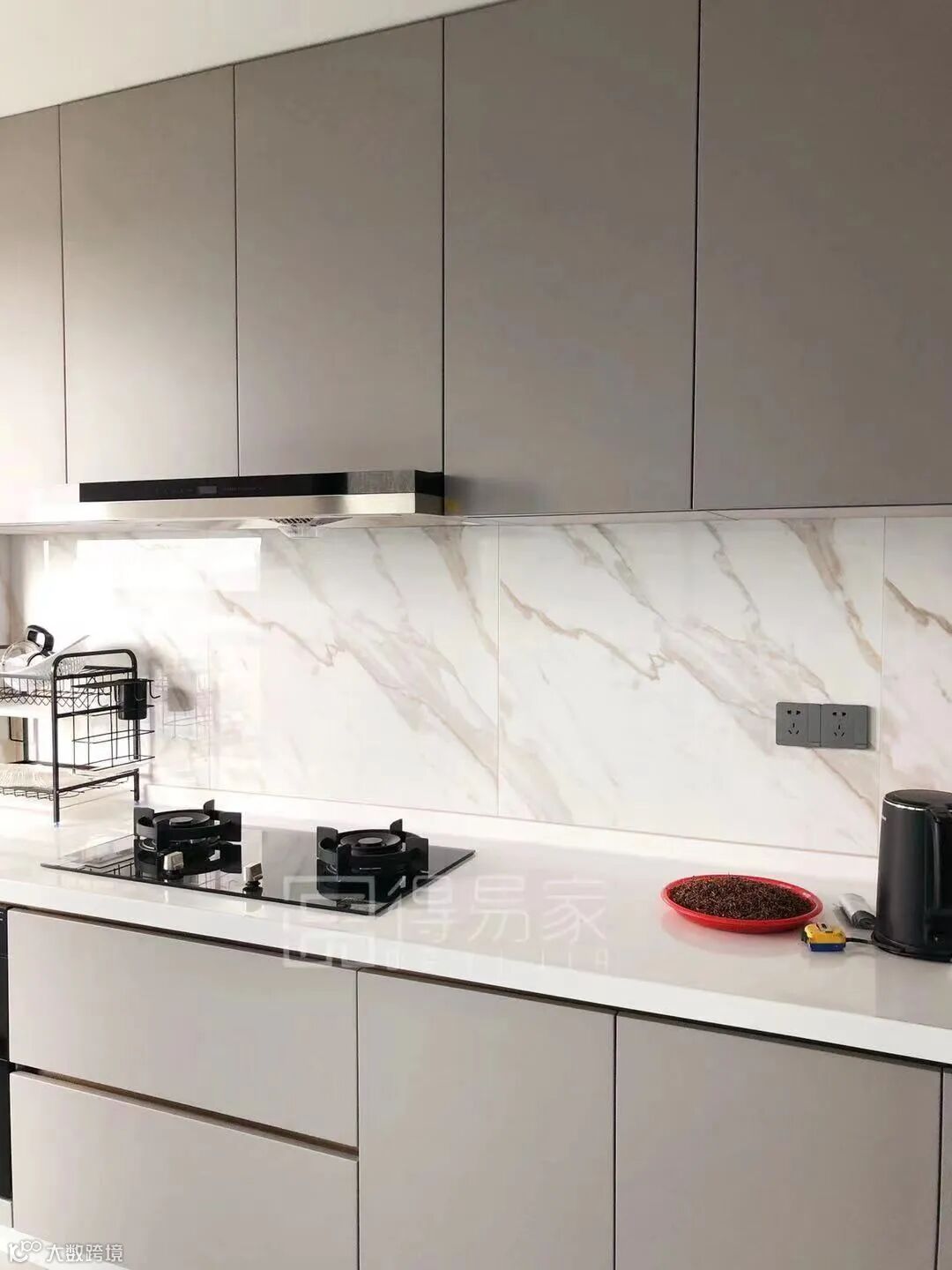 灰色为主调的厨房空间,同样是运用了U702 ST9 米灰色羊绒这款花色,花色的统一,保持了风格上的一致。