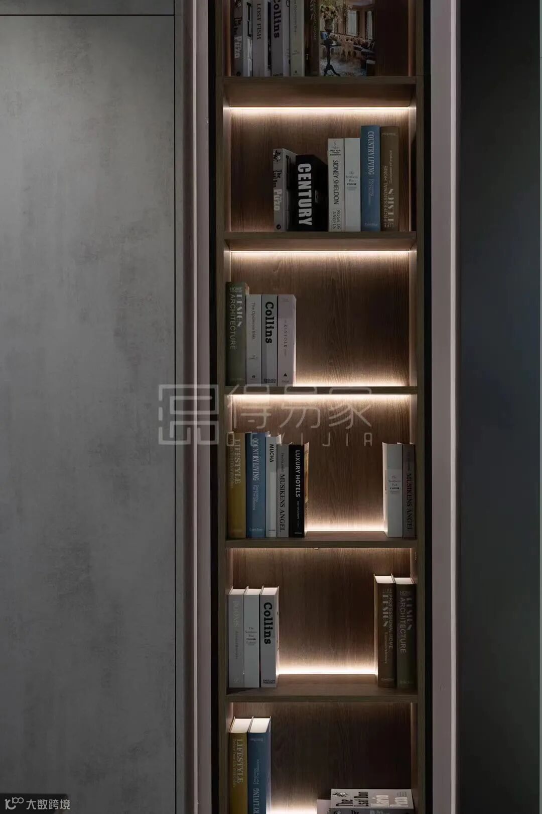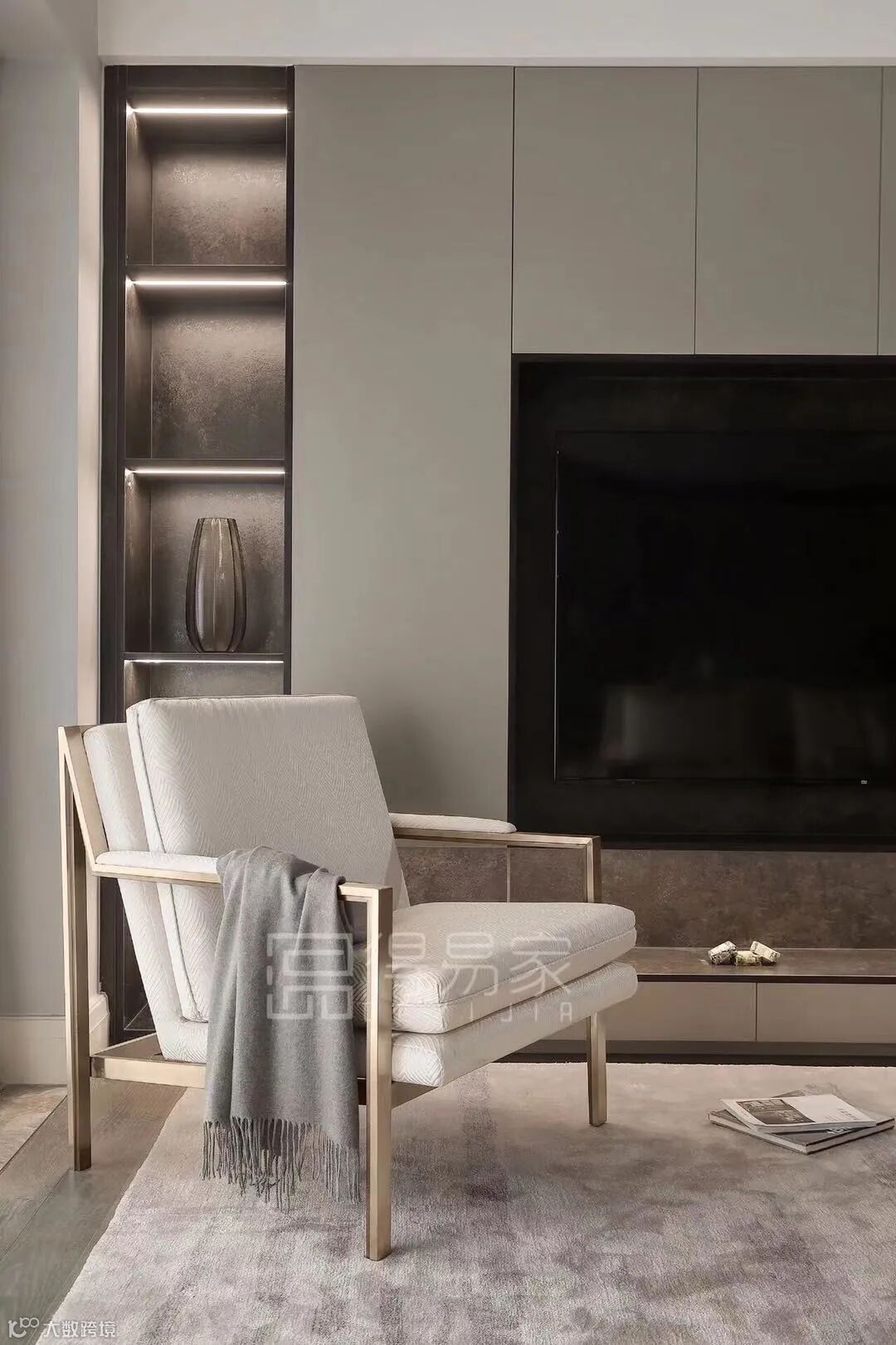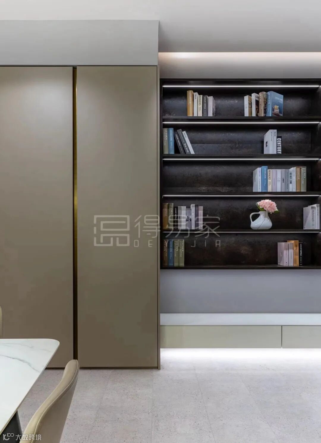 展示柜旁边的通高定制柜,运用了爱格U727 ST9石头灰这款高级而优雅的暖灰色。极简风无拉手柜门设计,左右两扇柜门之间留出缝隙方便开门,缝隙之处以金色线条进行装饰,起到了点缀的作用,更美观更有质感。