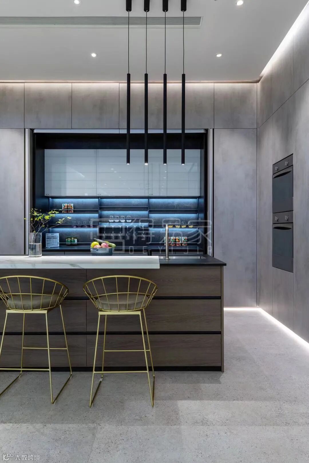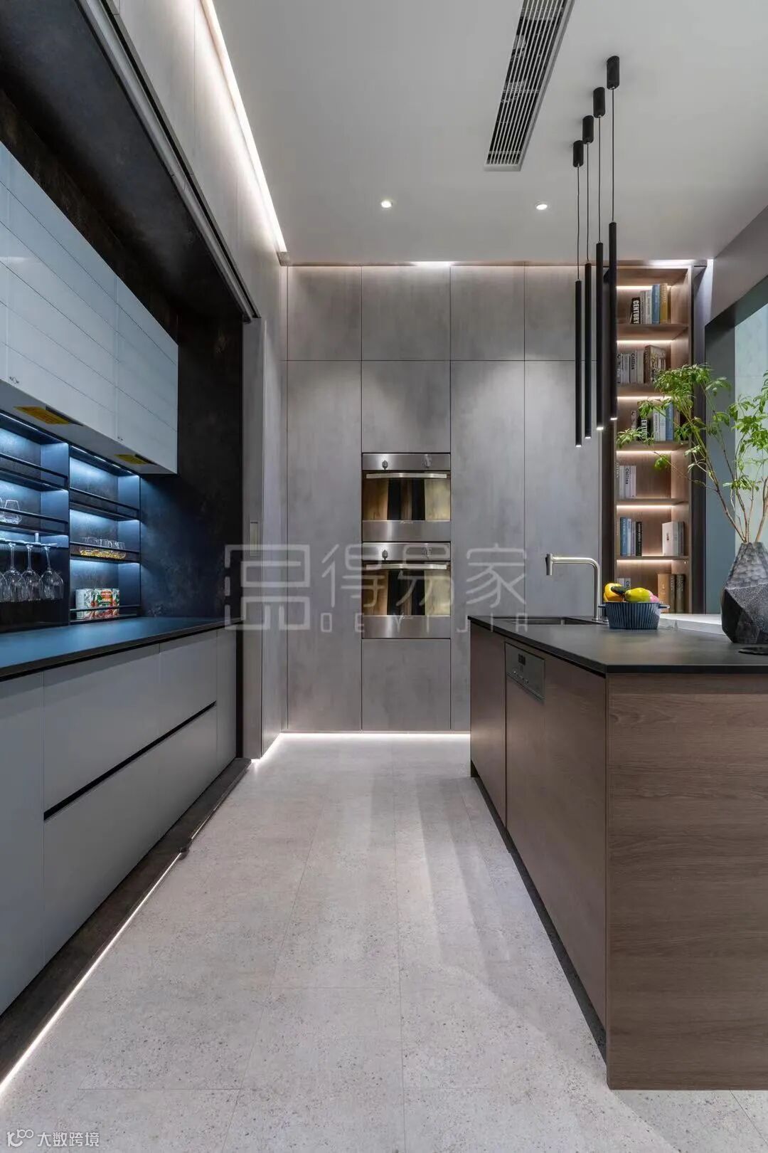 这款充满现代时尚感的橱柜,门板选择了爱格F638 ST16 铬金属银灰,岛台和展示区运用了H1379 ST36棕色奥尔良橡木,这两款花色都是爱格热门花色,两者的搭配自然沉稳,优雅高级。