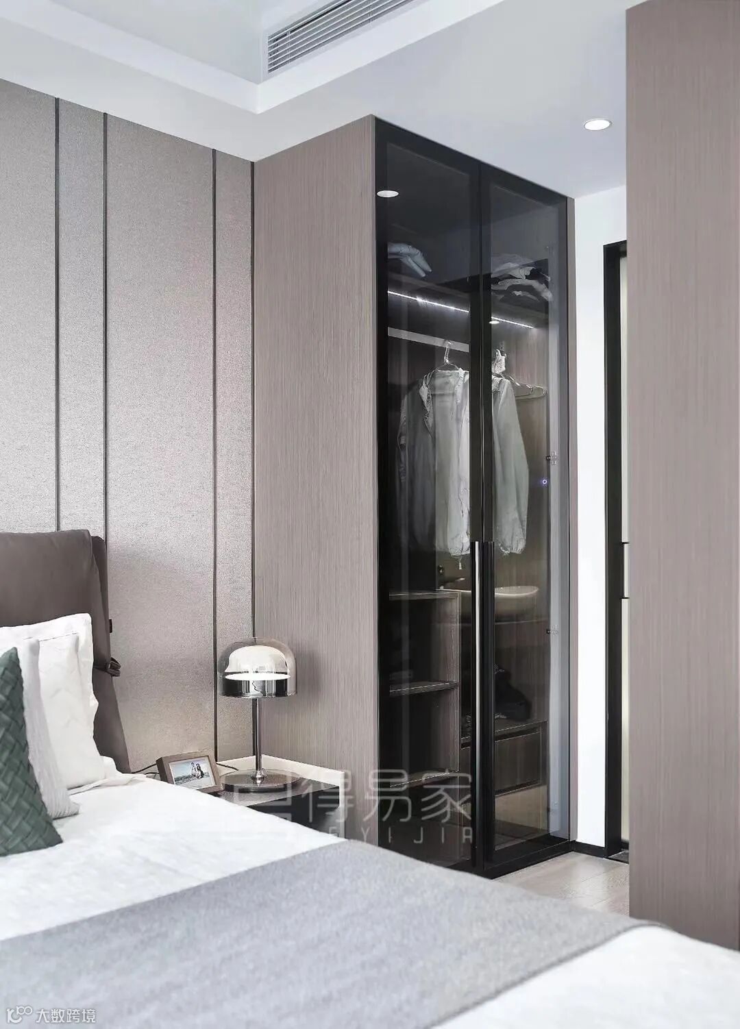 床尾的入墙衣柜,运用了爱格U708 ST9这款优雅中性的浅灰色做柜门,加上内嵌的金色线条和长虹玻璃柜门的设计,简约而不单调,大气而精致。