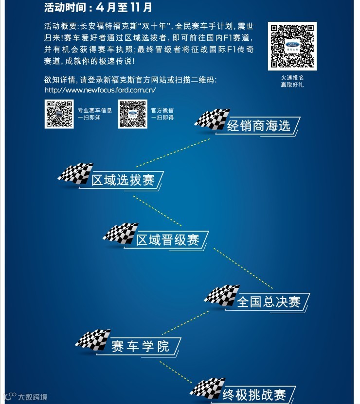 赛车爱好者可通过网站、门店,以及app、微博微信公众号等丰富多样的创新移动应用方式报名参赛,也可在长安福特全国线下梦工场巡展、品牌体验馆活动、CTCC活动、安全节能训练营活动现场报名;通过区域选拔者,即可前往国内F1赛道,并有机会获得赛车执照;最终晋级者将征战国际F1,在票选优胜的传奇赛道,成就您的极速传说!