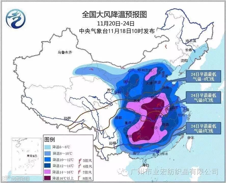 另外,20日至24日,受另一股强冷空气影响,我国中东部大部地区自北向南将先后出现大范围雨雪和大风降温天气,平均气温将普遍下降6~10℃,其中,西北地区东南部、华北西部和南部、黄淮中西部、江淮中西部、江南中西部、华南中西部以及四川东部、重庆、贵州等地气温将下降12~14℃,河南、安徽西部、湖北、湖南、贵州南部等地的部分地区降温可达16℃以上。上述地区伴有4~6级偏北风,东部和南部海区风力有7~9级。11月24日凌晨,华北平原北部部分地区最低气温将达到-10℃左右,最低温度0℃线位于淮河、汉江到四川北部和川西高原一线,江南南部和华南北部最低气温将达到4~8℃左右。预计,20日白天至23日白天,内蒙古中西部、西北地区东部、华北、黄淮、江淮西部和北部及江汉北部等地自北向南先后出现雨转雪(或雨夹雪)的天气,大部地区过程降水量10~30毫米;降雪量普遍有4~9毫米,北京西部和北部、河北西部和北部、河南中西部、陕西关中及南部、湖北西北部等地降雪量可达10~15毫米,局地可达20毫米。