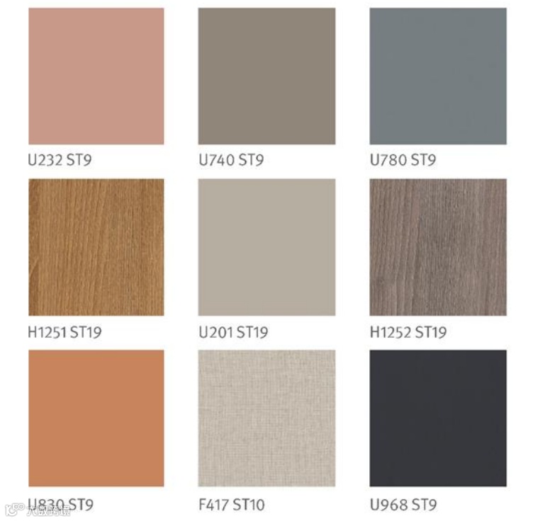 同色亦多彩这一潮流主题同样精选了9种花色,除了裸色系,灰棕色系与蓝灰色系的潮流单色类型以外,木纹以及材质花色在同色亦多彩主题中也扮演了重要的角色,通过同色系不同的色彩饱和度、不同表面处理,去丰富设计的情感,增加设计的生命力。