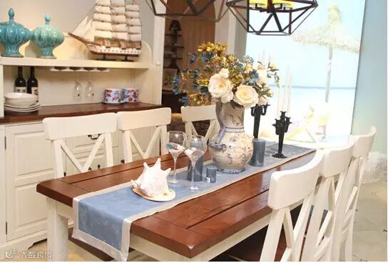 家具颜色搭配:淡颜色的美式家具适用于小房间或者采光条件较差的朝北房间等, 照明较好的房间可选择深颜色的家具、可显出古朴、典雅的气氛。也可深浅色相结合,如上图,更加有层次感,软装搭配清新的蓝色,营造出自然、悠闲且舒适的家居环境。