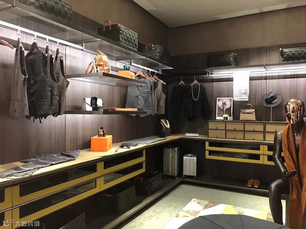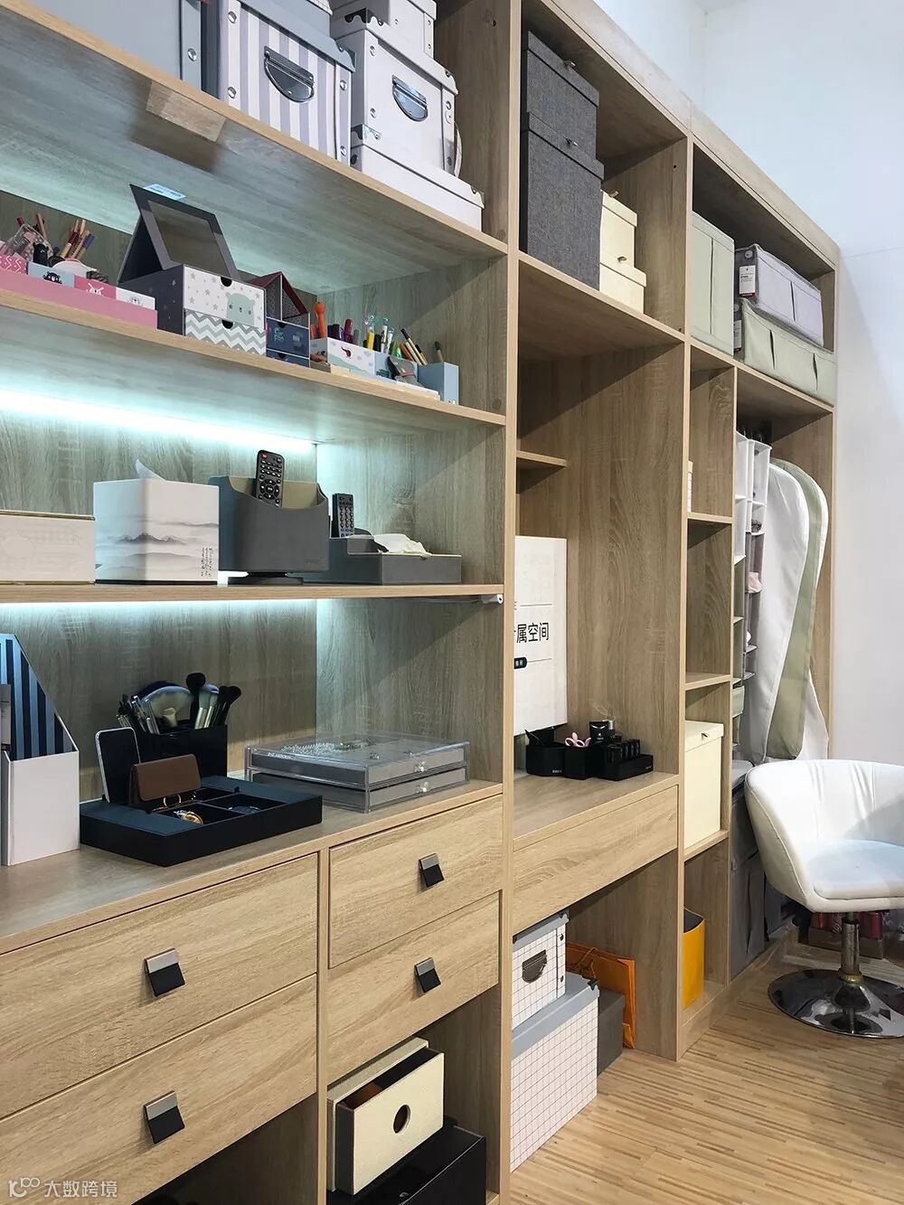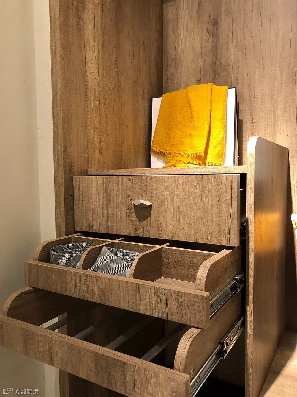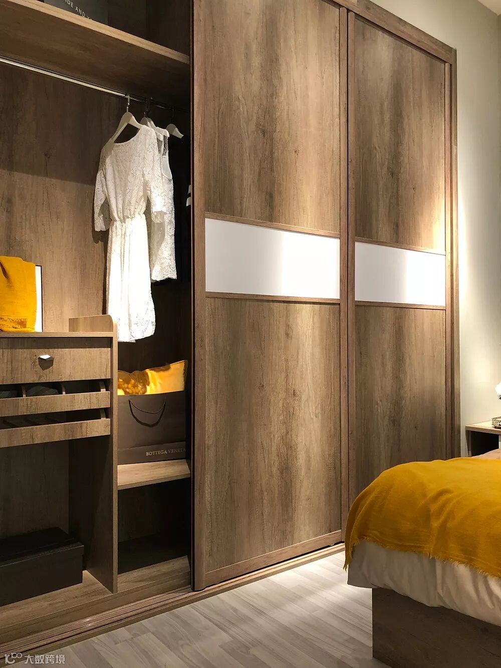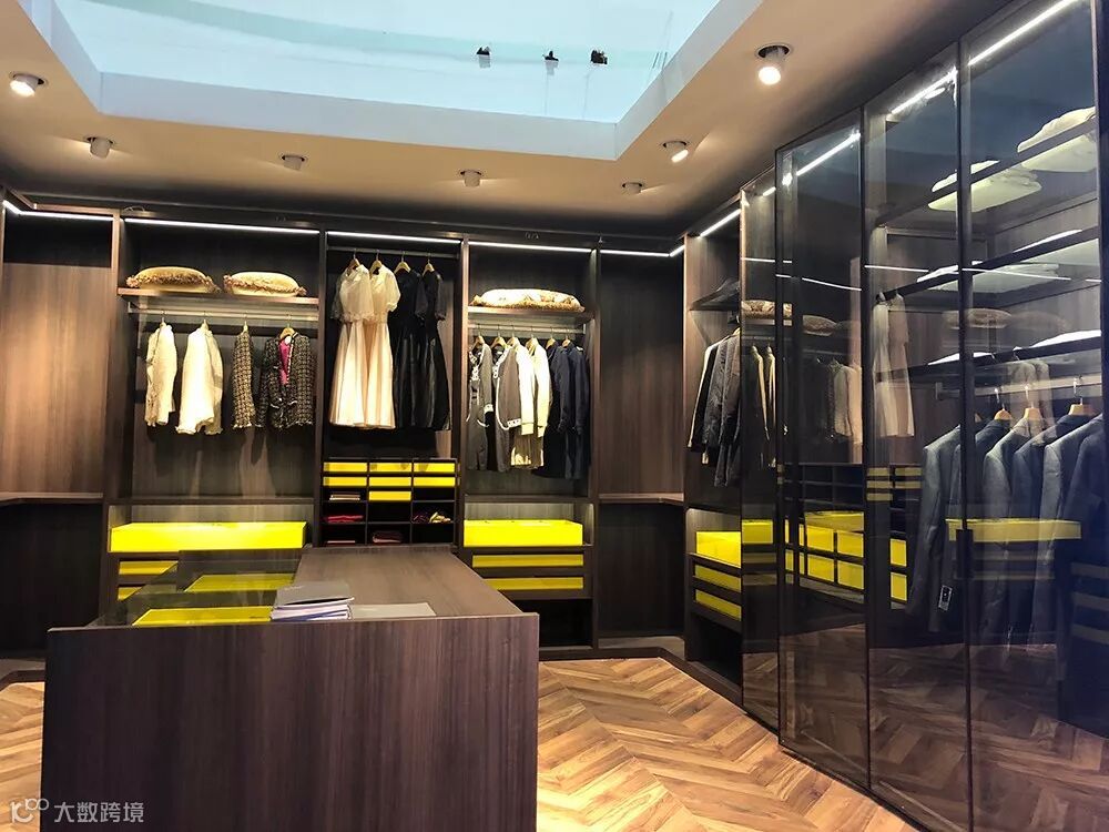 这款开放式的衣帽间,使用了爱格现代胡桃木花色,奠定了整个空间的基调,在黄色与金属色的搭配之下,整个空间显得优雅绅士,简约时尚。