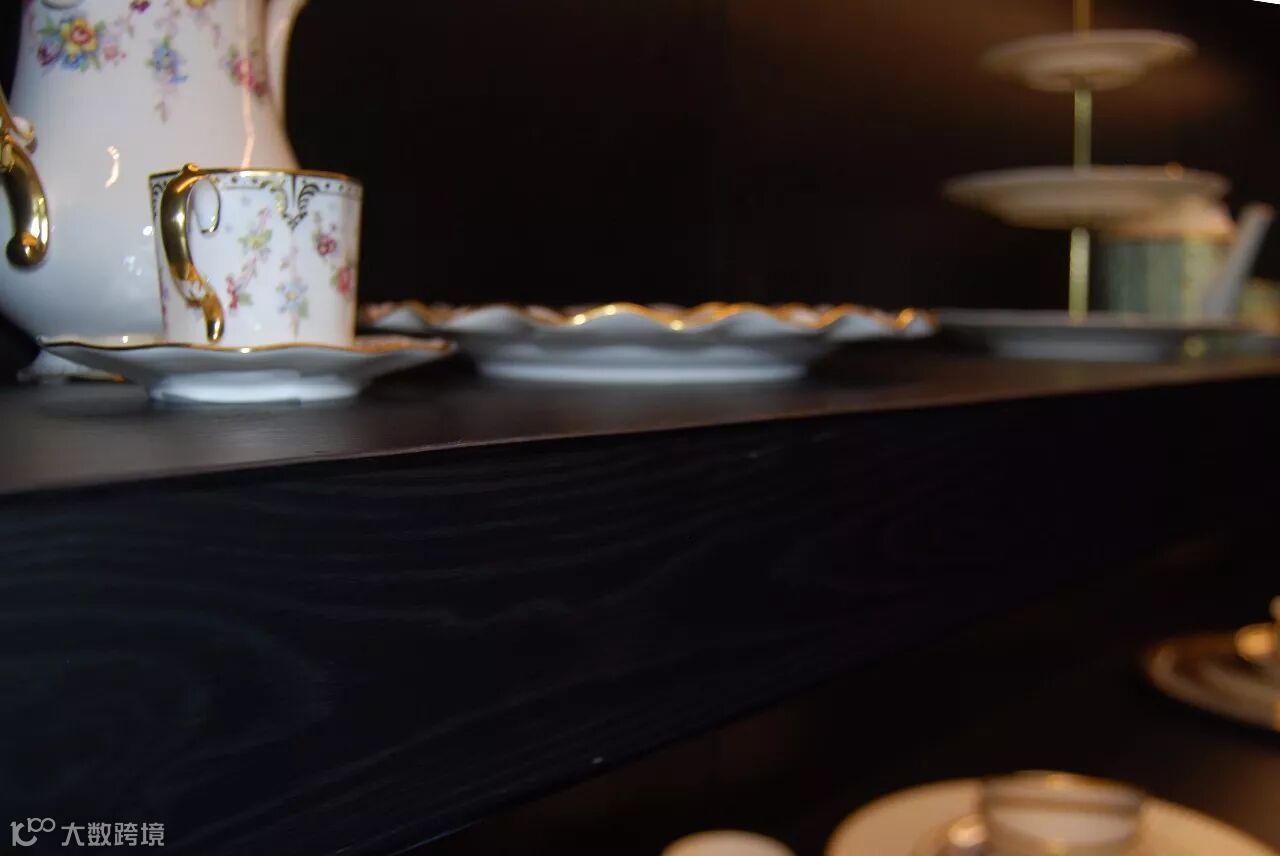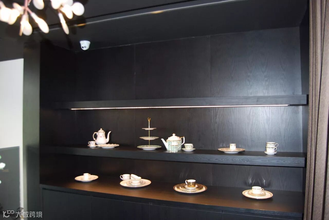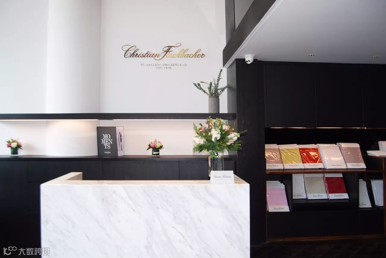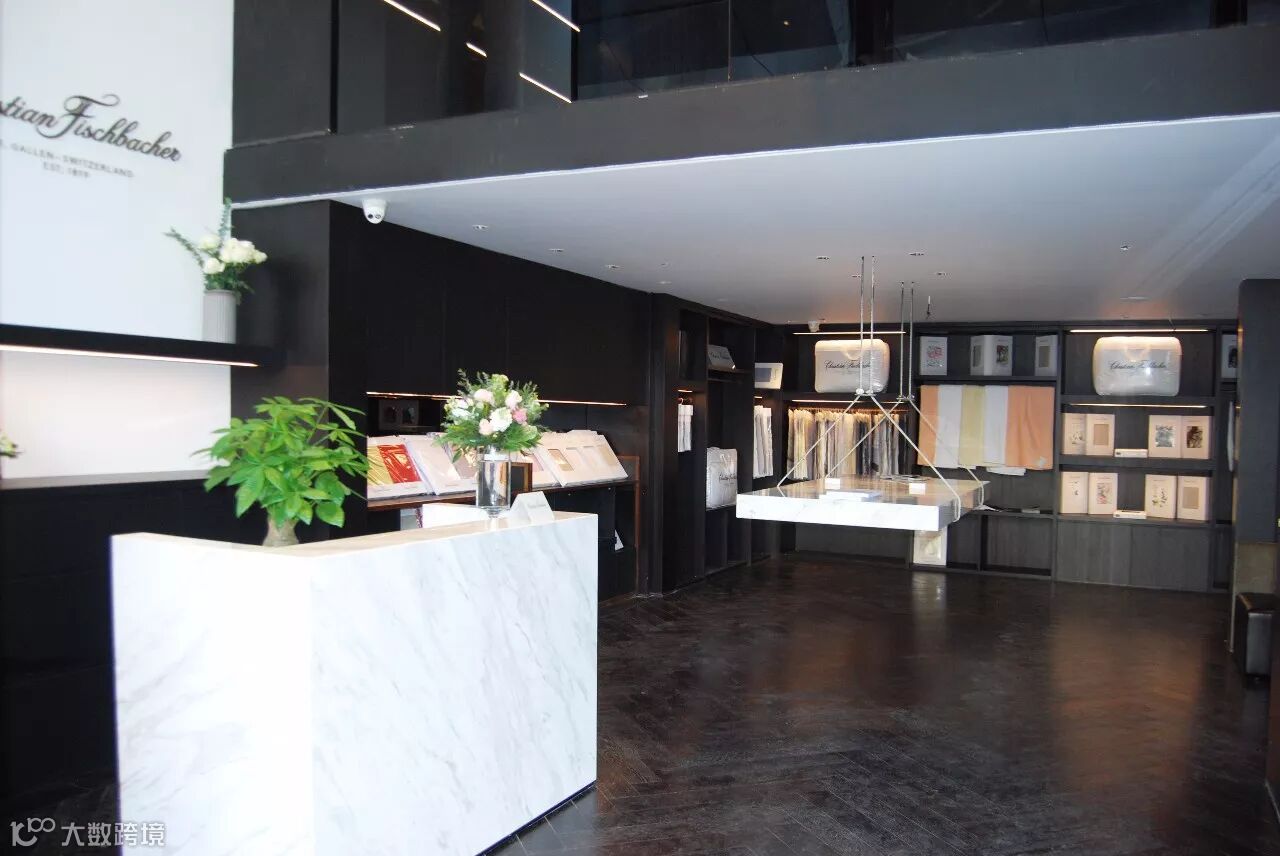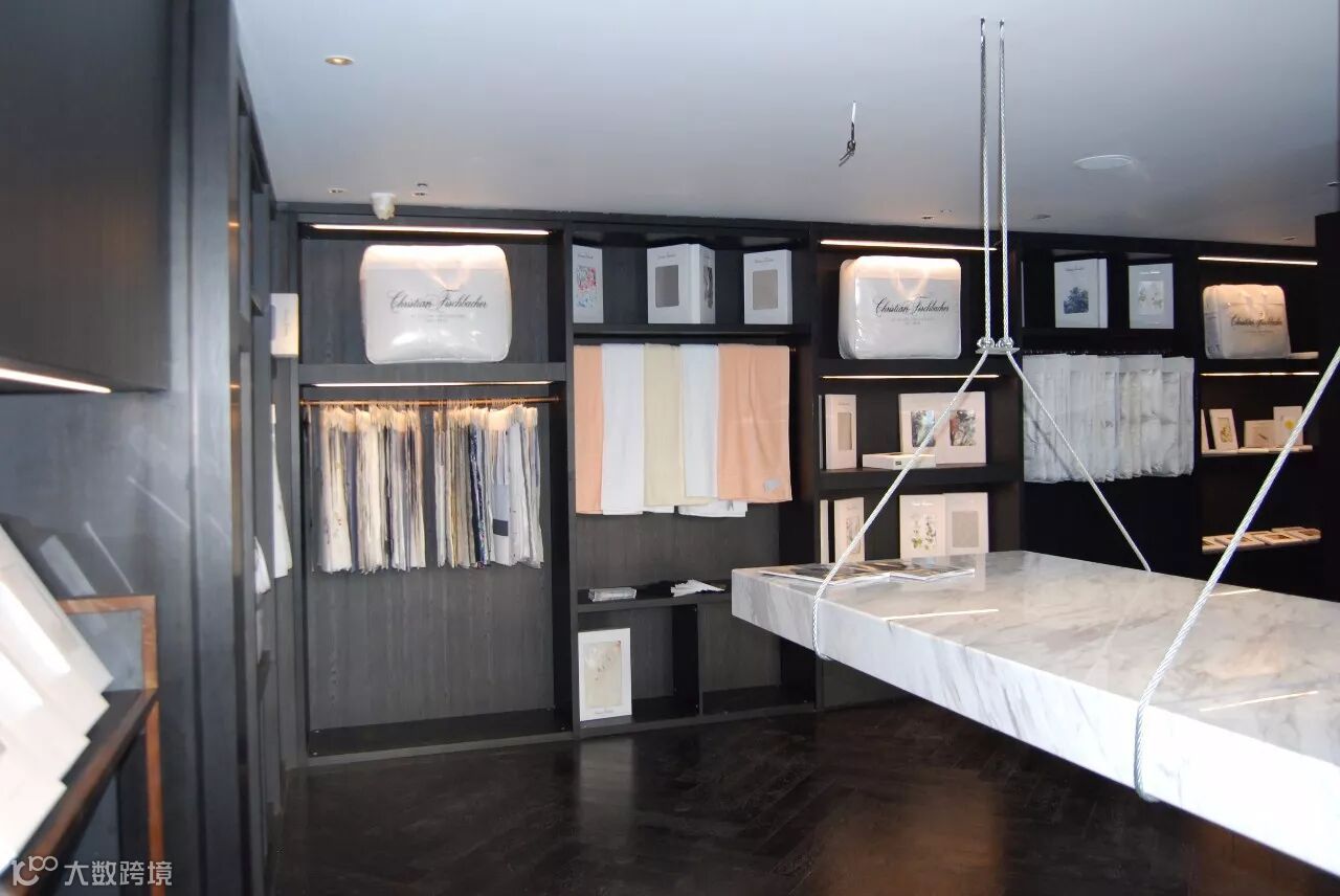 中间是一面墙的展示柜,都是用爱格U999 ST38黑色打造面成的,黑色的包容性更突现出了瑞士顶级纺织品牌 Christian Fischbacher 费斯巴赫纺织品的艺术感。