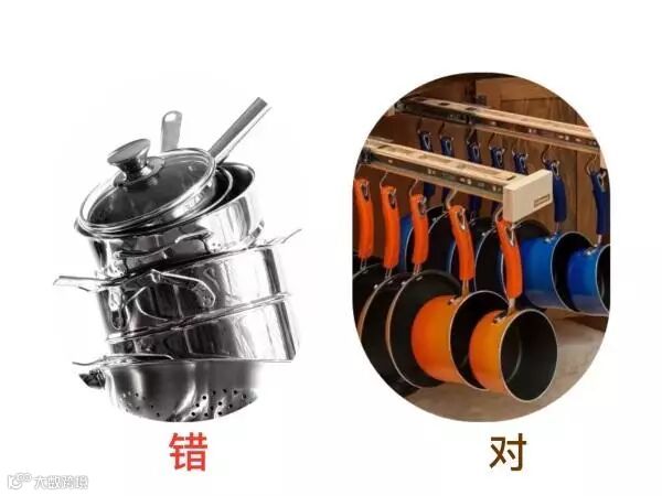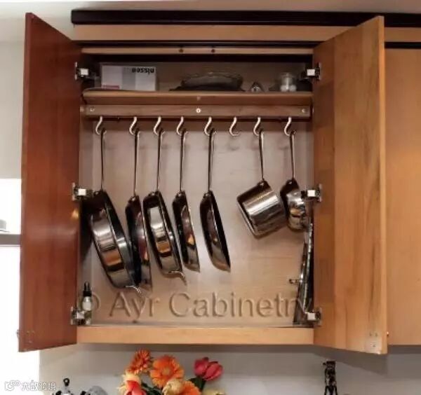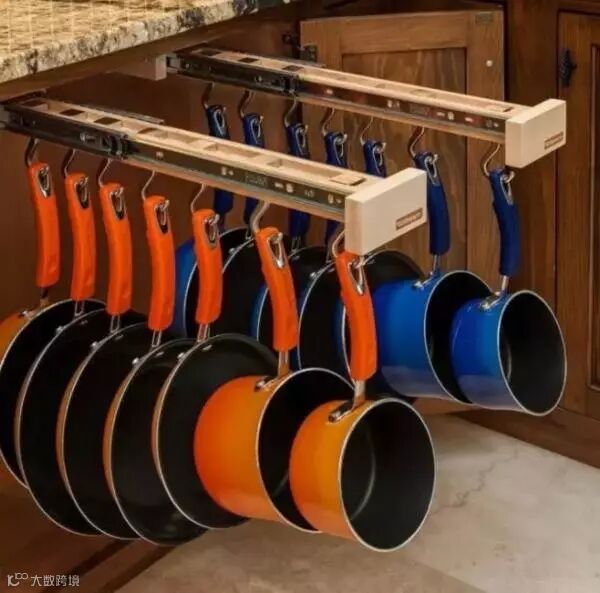 家中最多的就是各种锅具了,炒锅、平底锅、汤锅、蒸锅等至少需要4-5个左右才能满足烹饪需求,与其堆放在各个角落里,不如在橱柜里安装可抽拉式的阻尼挂钩,因为出于饮食健康考虑,把锅吊起放更有助于沥干水份,比起叠放更卫生,拿取也方便。
