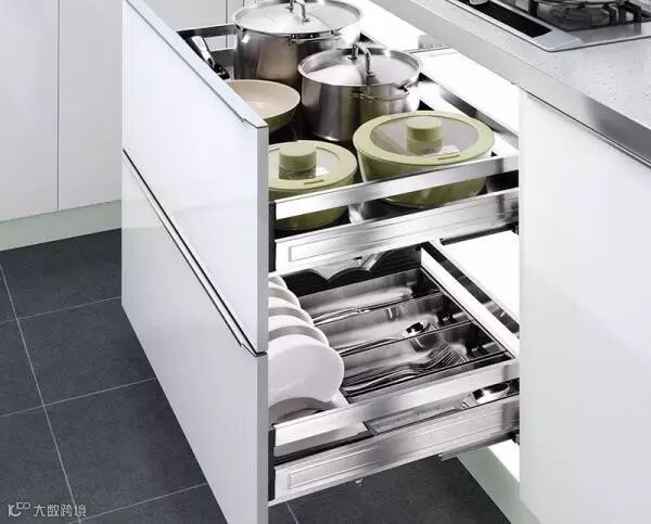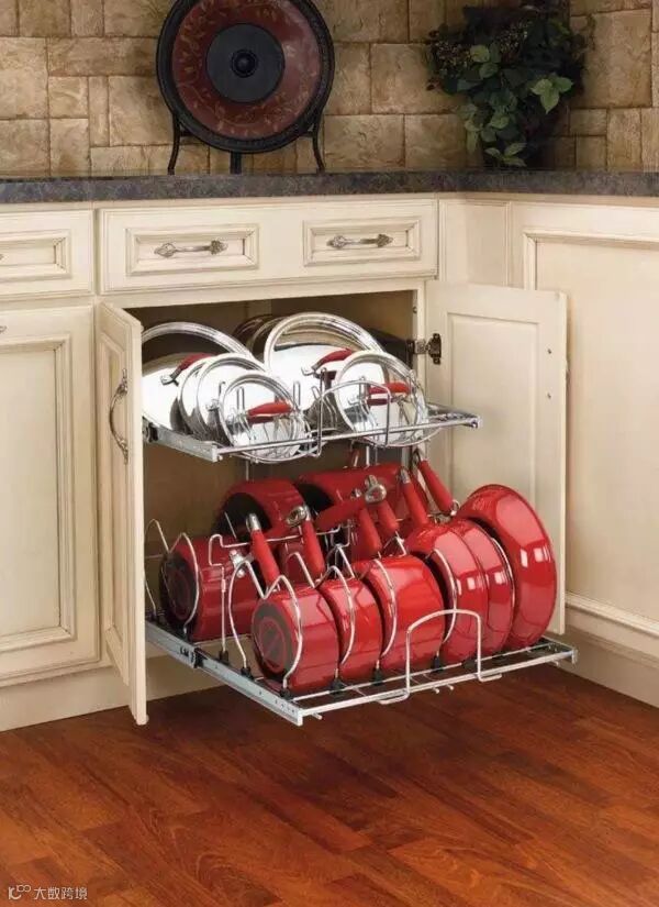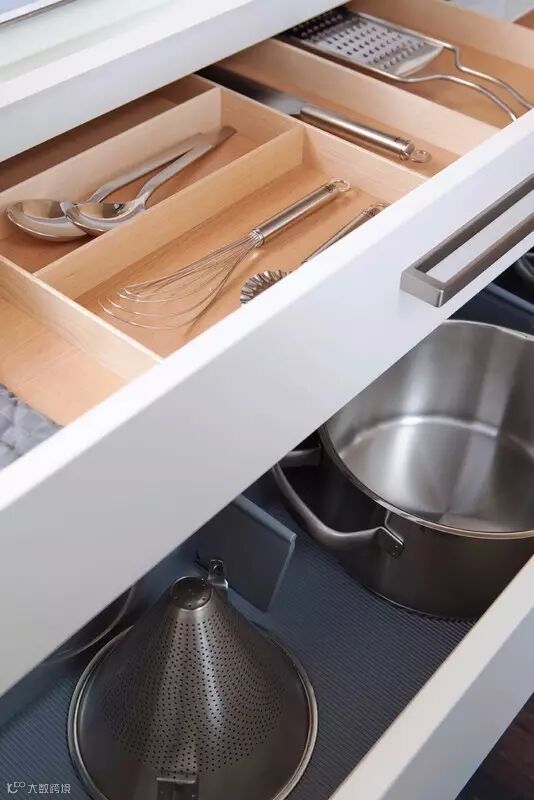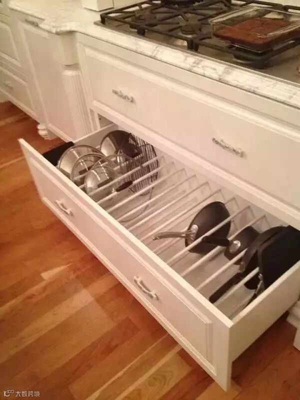 或者专门定制一个可放锅具的抽屉,沥干架可根据锅的厚度来调节距离,这样家里所有的锅具和盖子,一个抽屉就足够容纳得下。