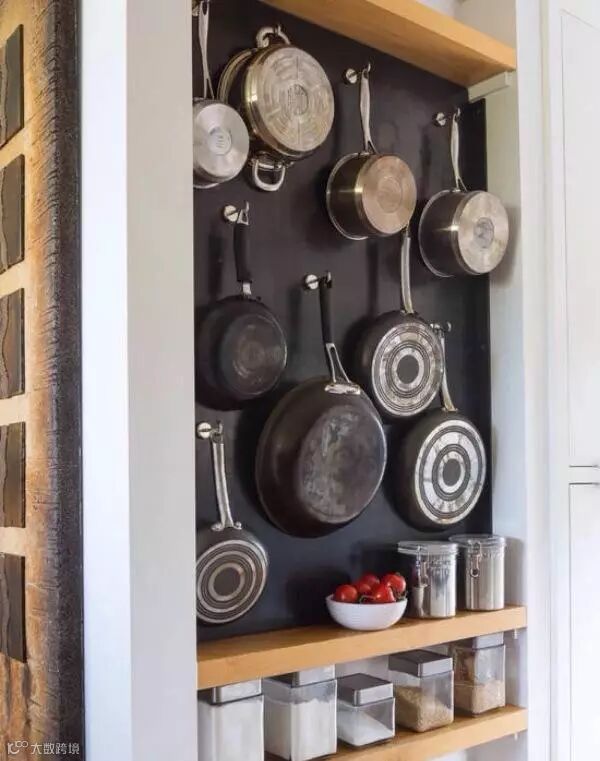 都挂在墙面上也是不错的选择,黑色背景墙使大小不一的锅具不会显得过于突兀,视觉上也不嫌得凌乱。