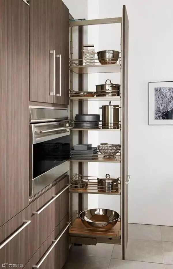 如果把厨房的边边角角利用起来,使用空间会让你意想不到,夹缝处定制一个抽拉柜,大大小小的汤锅、洗菜盆、烘培工具等安放至此刚刚好。