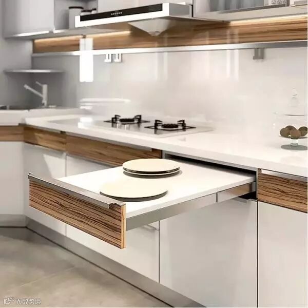 小户型虽没有国外开放式厨房的大空间,但也急需一个“人性化”的操作台,定制这样一个抽拉式料理台,也算解决燃眉之急,不用的时候推放到橱柜里面,也很方便。
