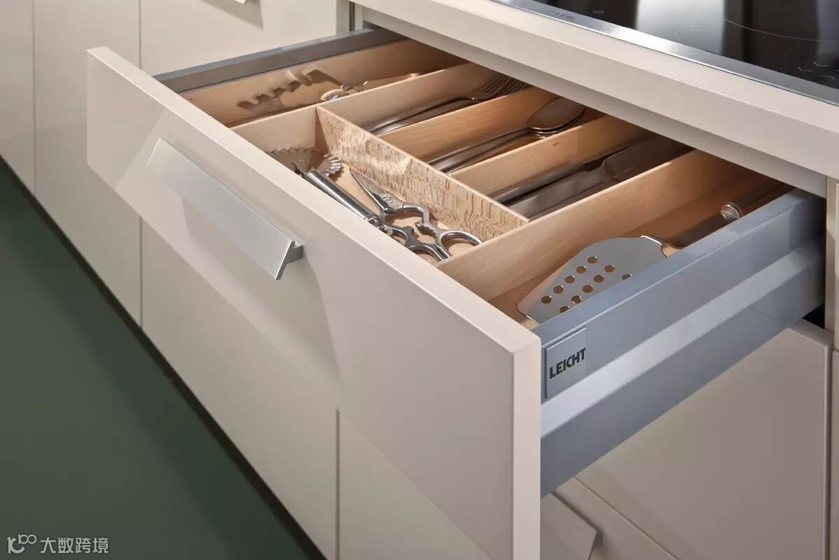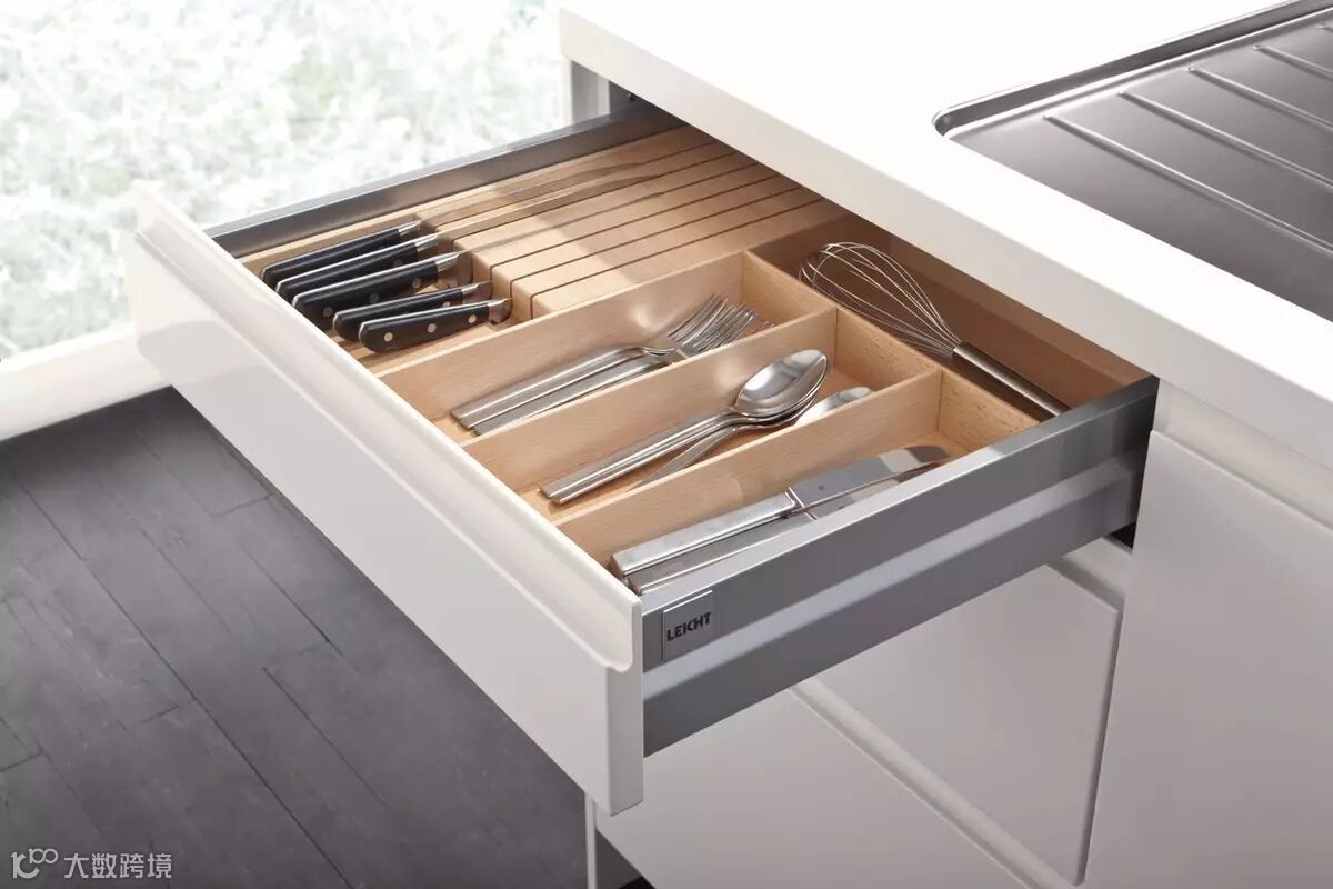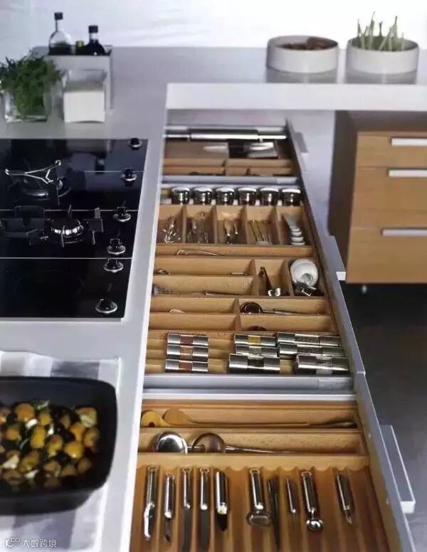抽屉里一定别忘了定制专用隔断盒,用来归类收纳刀叉、铲子、勺子、筷子、刨皮刀等随手可取的小餐具。