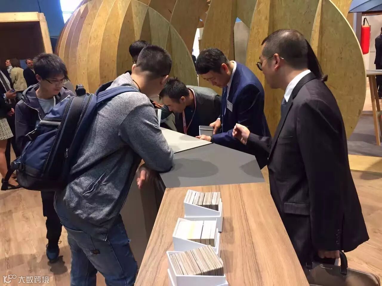 (爱格展厅内客户正在仔细观看产品)