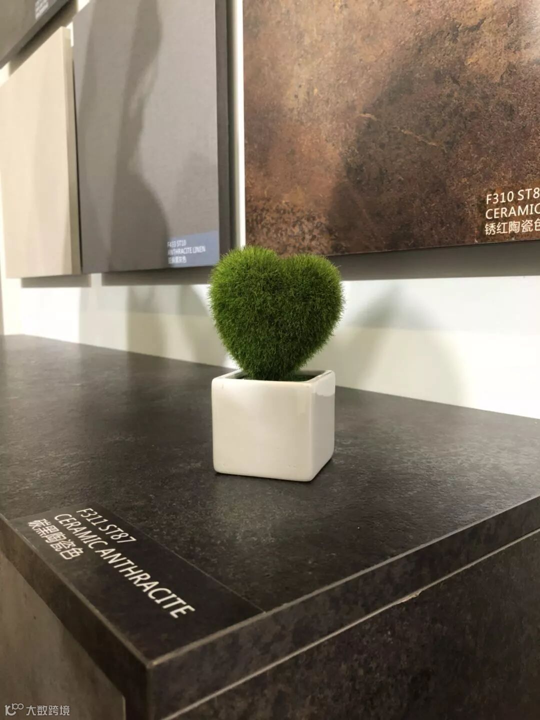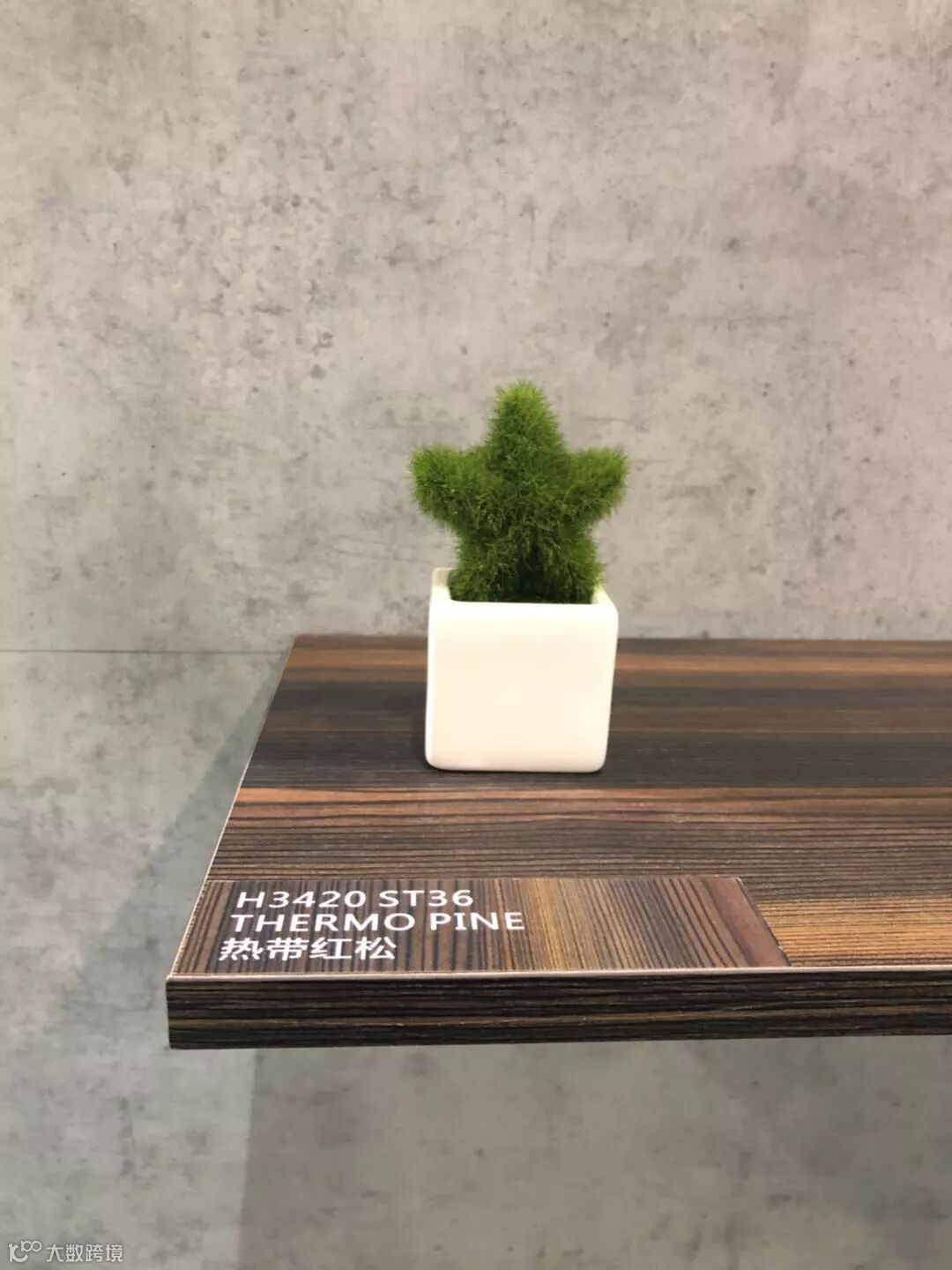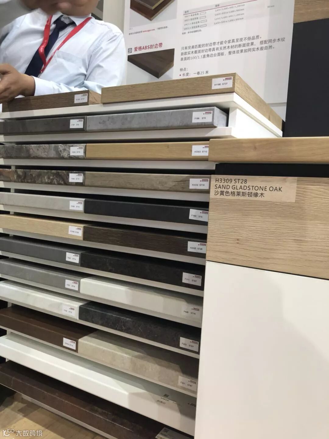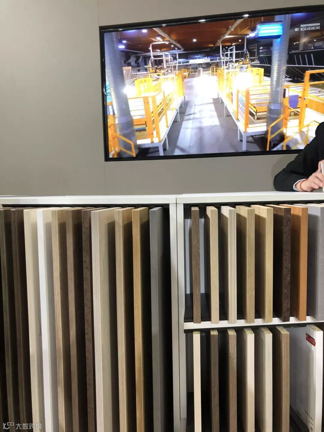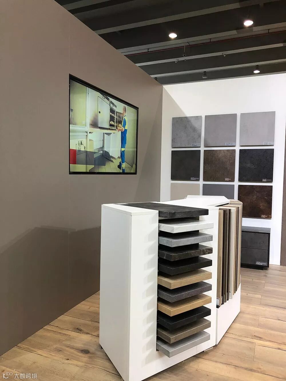 前台背后是一面米灰色的电视墙,摆在电视下面的产品展示架,展示了台面板、贴面板、和封边带。