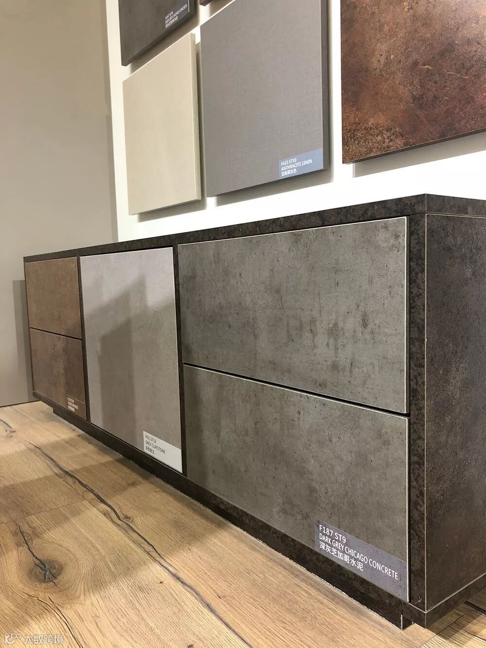 橱柜旁边是不同花色的台面板,以及相前的产品说明。