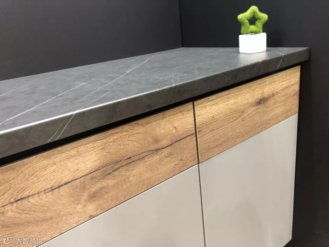 台面以不同尺寸的F302 ST87费罗黄铜色台面板制作而成,直角导边工艺让不少访客竖指称赞。
