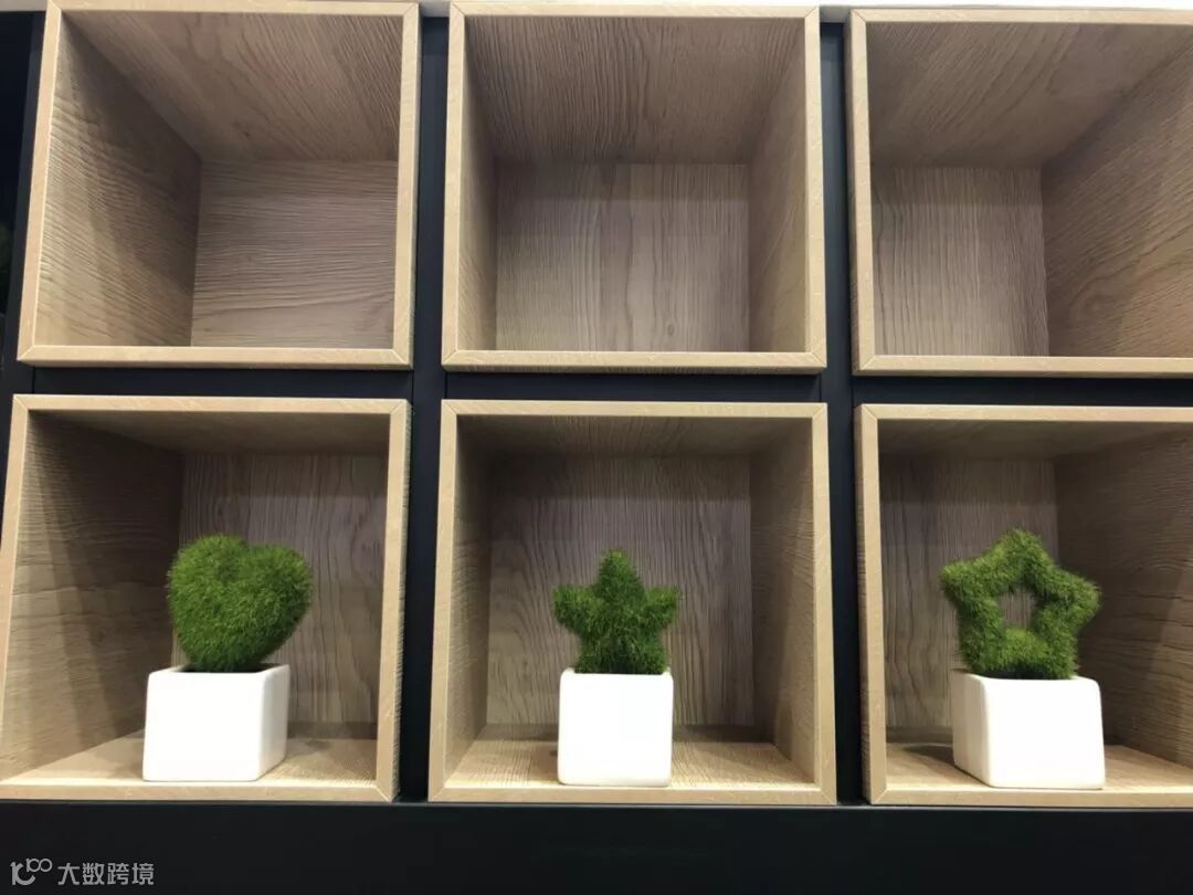产品展示台旁边是一个花色九营格和九宫格花色打造的矮柜。