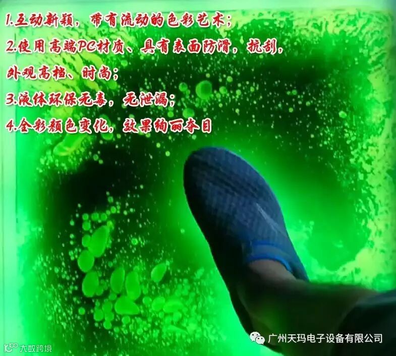 1.电压:AC90-260V。 2.功率:30W。 3.LED数量:144颗 5050SMD。4.颜色:RGB全彩。 5.面板:10mm钢化玻璃。 6. 防水等级:表面IP65,底部IP55.(如有户外需求,直接升级IP67不锈钢户外防水) 7.承重:500公斤/块。