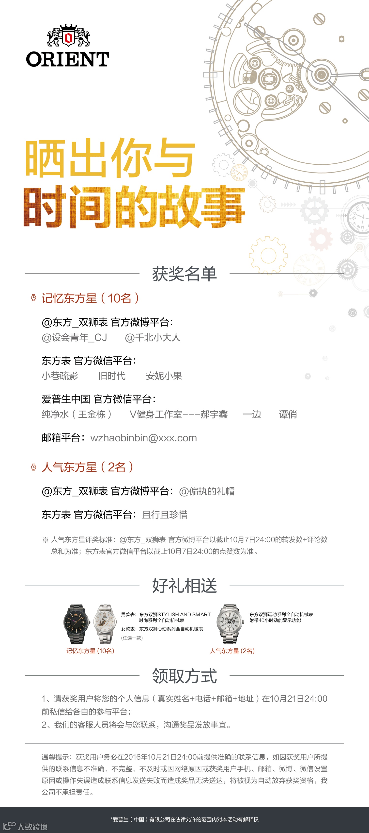 导读:东方双狮表“晒出你与时间的故事”征集活动圆满结束啦~为大家奉上中奖名单!