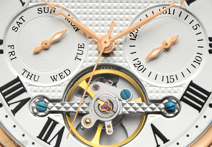 年、月、日、星期、小时等时间显示,既提供了多功能的时间提醒服务,又使得表盘立体感极强,契合了男士气质及其生活需求。南瓜形表冠经过设计别致,雕工精细,造型优美。
