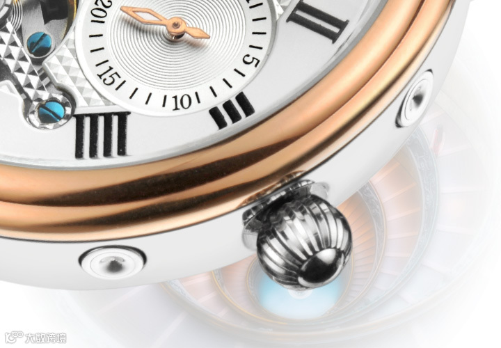6点位镂空设计,创意非凡,造型独特,装饰精美,令人瞩目,动感跃然。透过镂空视窗,腕表精密飞陀映入眼帘,十分引人。底盖镂空透视设计,使机芯韵律动感再次触动心弦。
