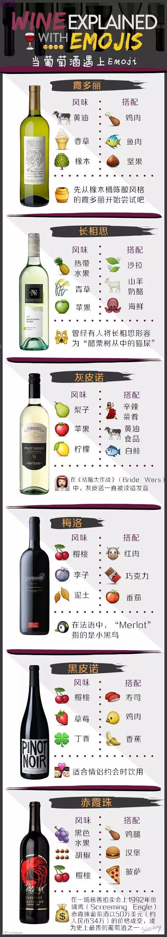 Emoji又称绘文字,是日本在无线通信中所使用的视觉情感符号。近年来,越来越多的人喜欢用Emoji来聊天,它已经成为人们日常生活社交沟通的第二种语言。这种表情符号不仅可爱动人,还能传神地表达人们想表达的心情,使得沟通变得更有意思。假如葡萄酒也会说话,它会用哪些Emoji表情来形容自己呢?一起来看看霞多丽(Chardonnay)、长相思(Sauvignon Blanc)、梅洛(Merlot)和赤霞珠(Cabernet Sauvignon)这些常见的葡萄酒怎么定义自己!