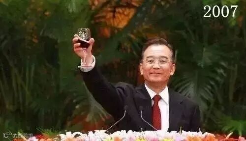 2007年温家宝总理在国庆招待会上祝酒,注意杯型和他持杯的方式。