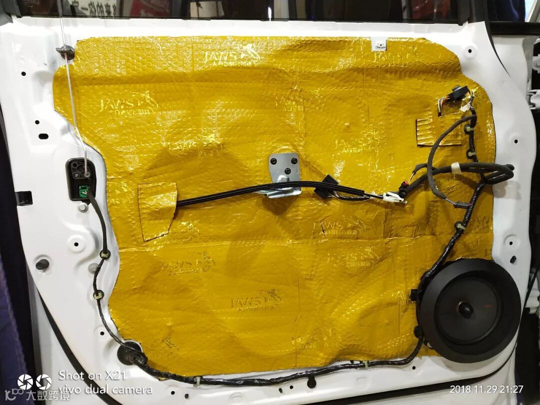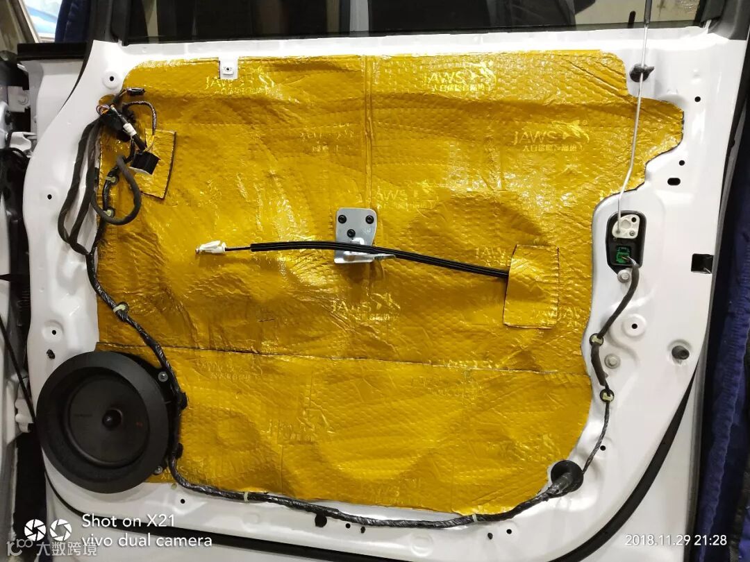 追求高品质改装效果之前,首先对车辆的四门进行了双层隔音,双层隔音处理不仅能够减少门板共振,阻隔风噪,更能够让门板变得扎实,对音响喇叭发挥出更好的功效非常关键。