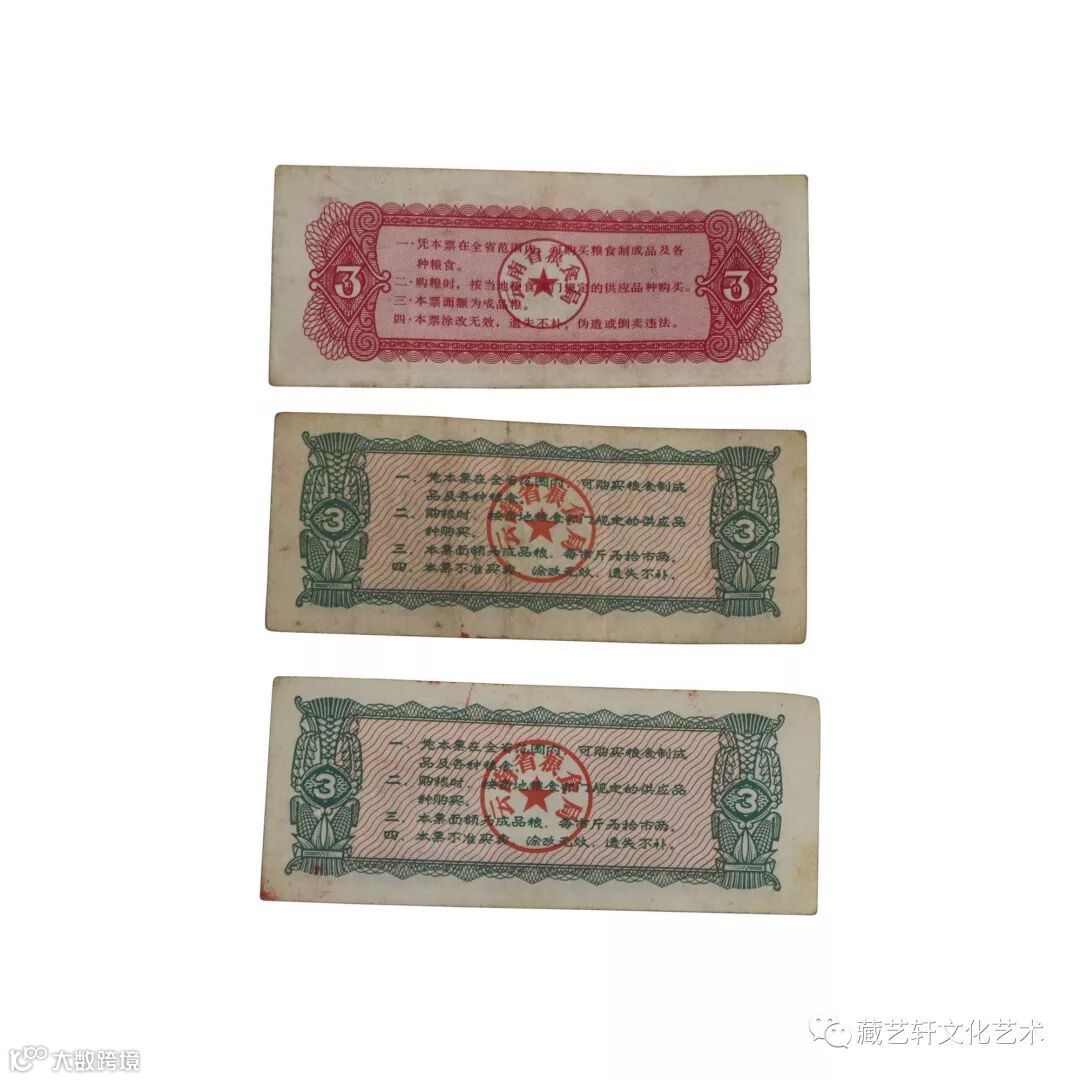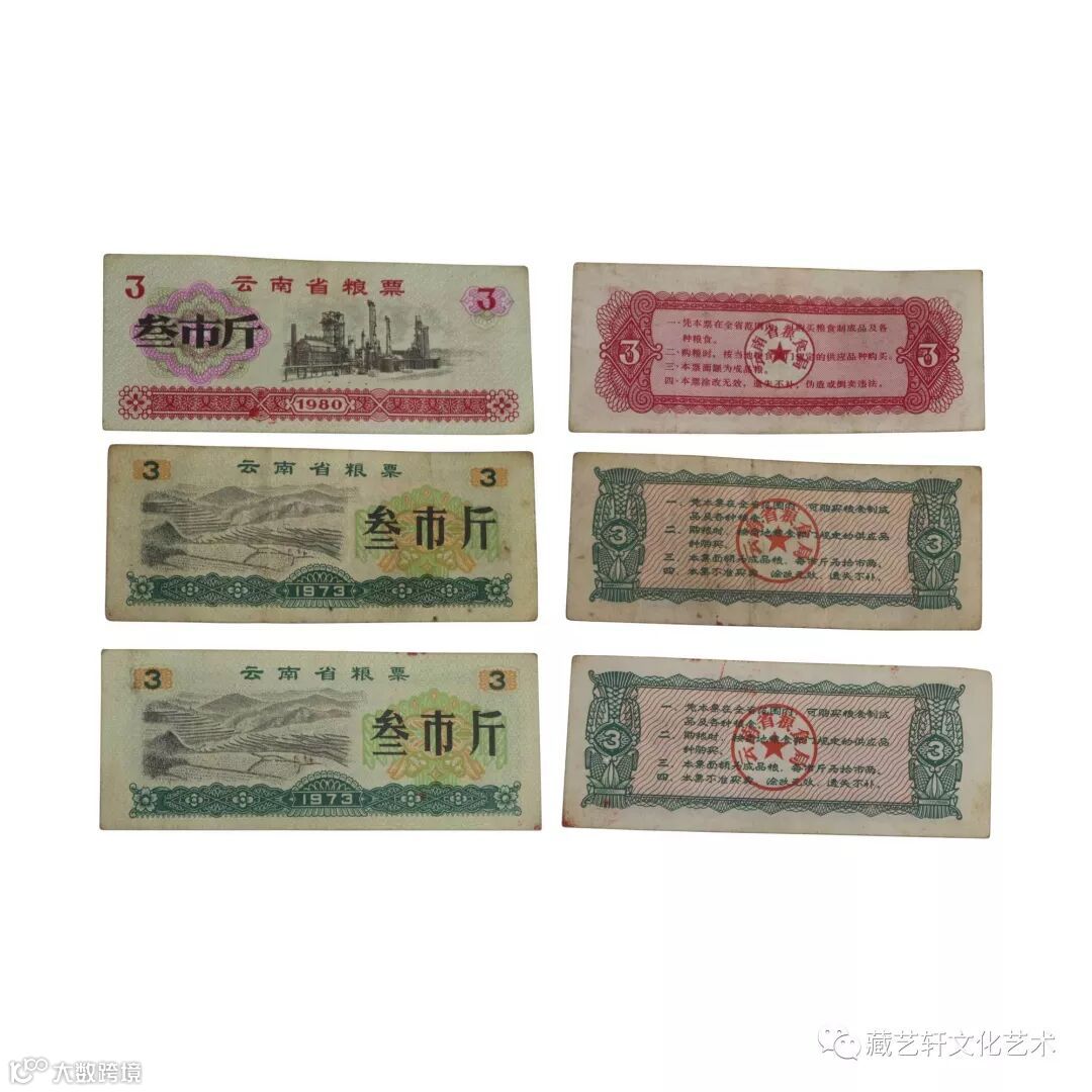 此三张一组藏品为“云南省粮票叁市斤”,其中一张为1980年,两张为1973年。此组粮票属于地方性粮票,由云南省粮食局发行,在云南全省范围使用。粮票正面上端为“云南省粮票”,1980年的左记值为“叁市斤”,1973年的右记值,下方为粮票的发行年份。背面为粮票的使用说明。在票证年代里,票证被老百姓视为“生命票”、“第二货币”,因此票证便与钞票平起平坐,甚至比钞票还珍贵。此组粮票存世稀少,意义非凡,收藏价值极高。