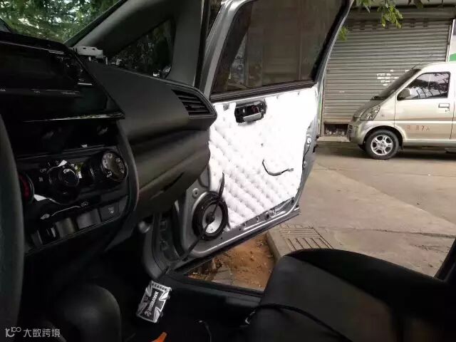 拆开车门内饰板,隔音防水措施仅有一层塑料薄膜,根本起不到什么效果。将原车的隔音材料清除,换上了效果更为出色的隔音材料,并且对门饰板也做了隔音处理,彻底解决汽车门板的噪音问题。