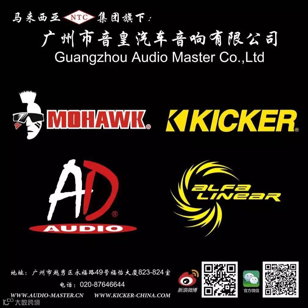 广州市音皇汽车音响有限公司作为美国KICKER(K 牌),MOHAWK(豪客)音响品牌中国区唯一总代理,一直代理此品牌20年,从未授权、委托任何单位或个人从事生产制造,所有加盟代理销售的实体店、网络销售店,都必须拥有本公司正式颁发的授权证书。
