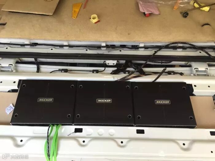 三台KICKER IQ系列高级功放一排安装在后尾箱