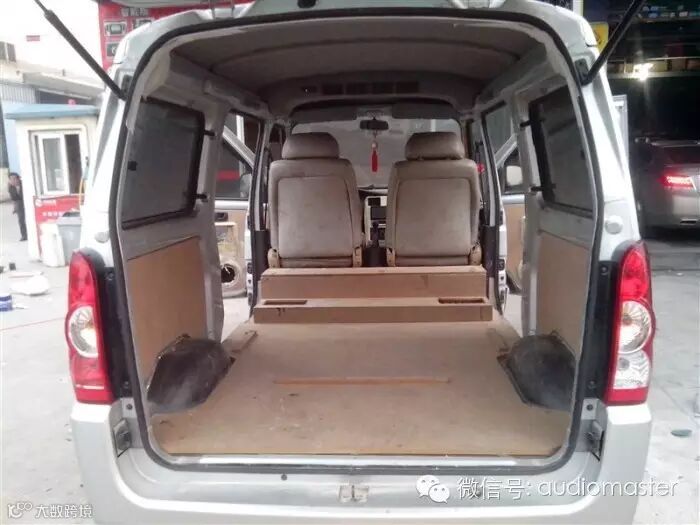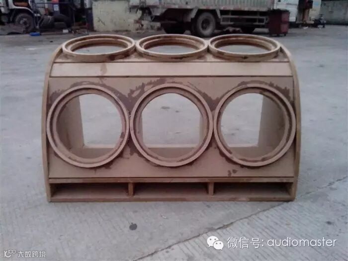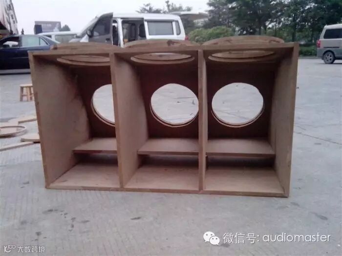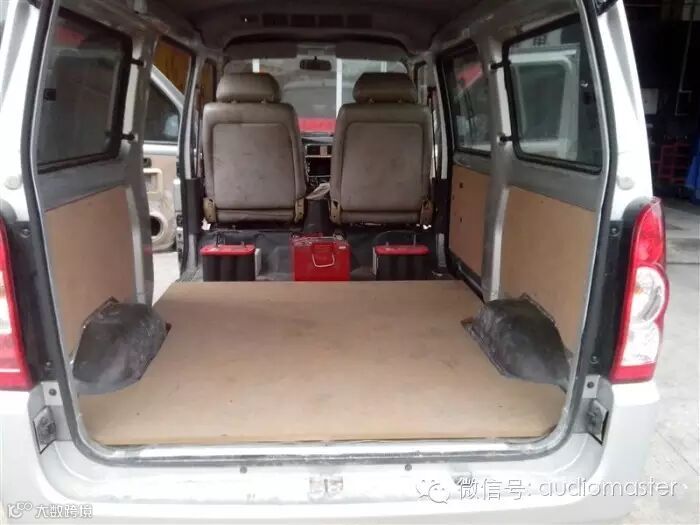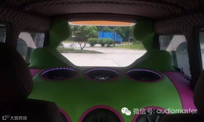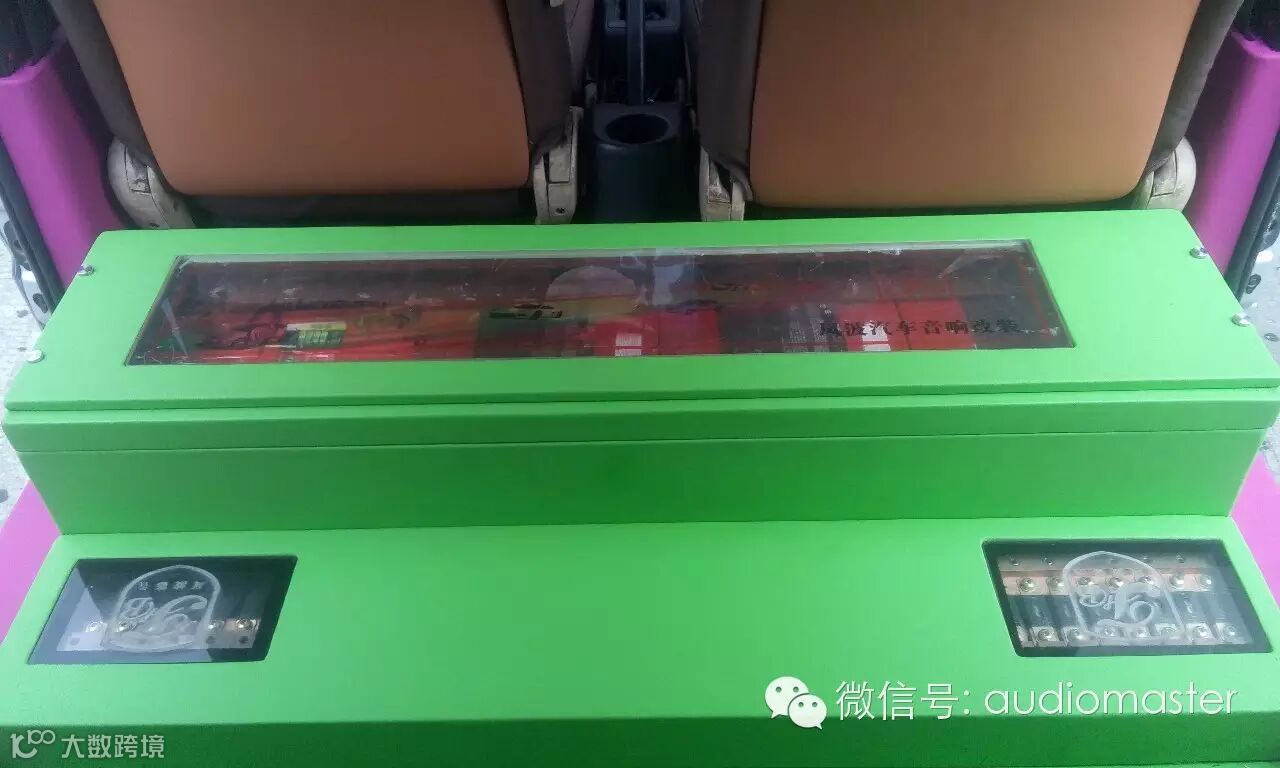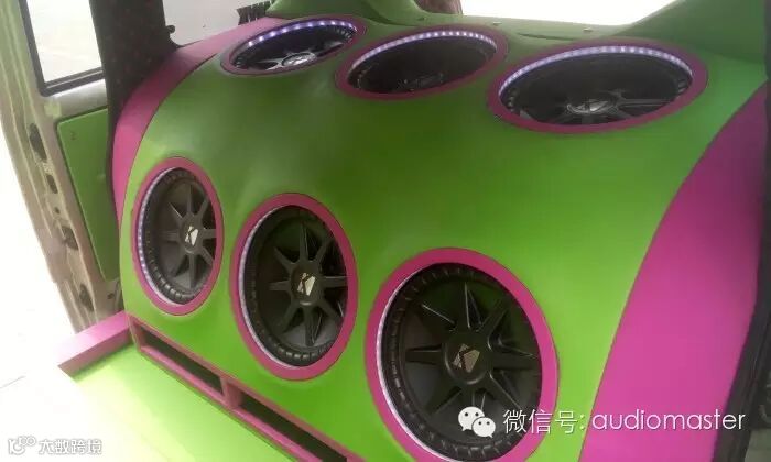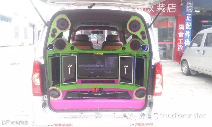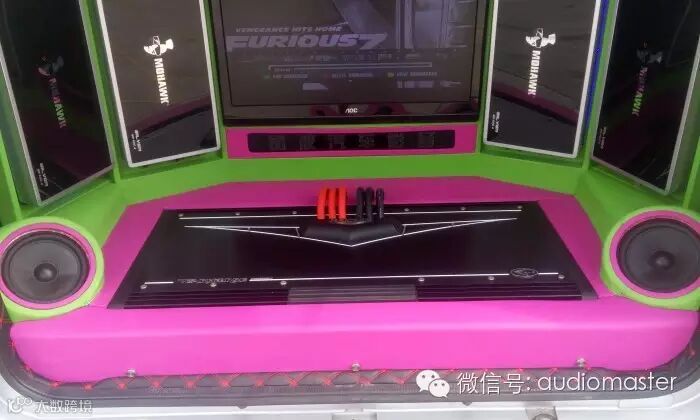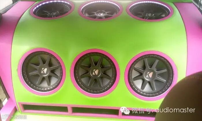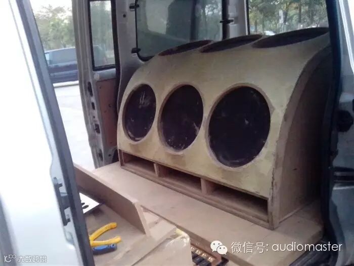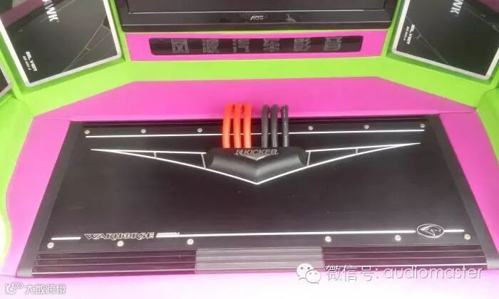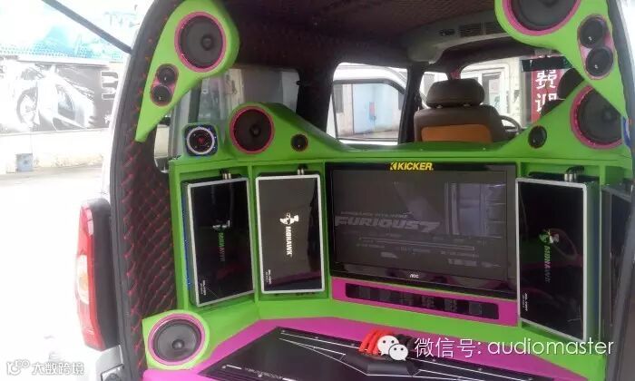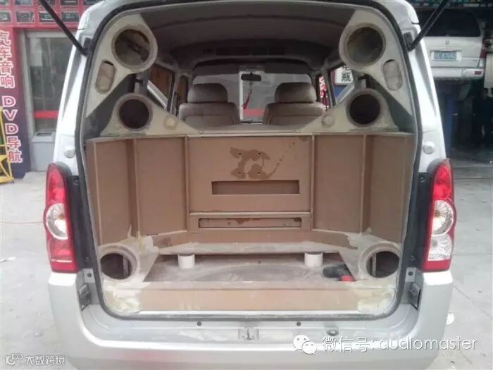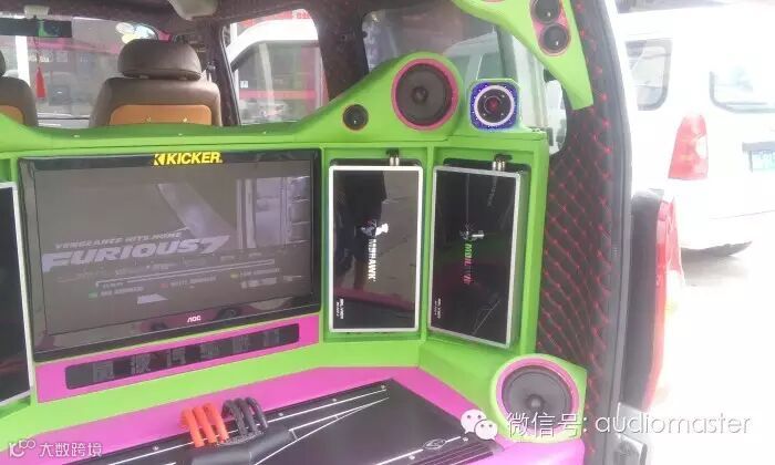 尾箱的造型,29寸电视机安装在中间,四台豪客功放竖着安装在两边,K牌WX10000.1安装在下面,喇叭圈固定在四个角