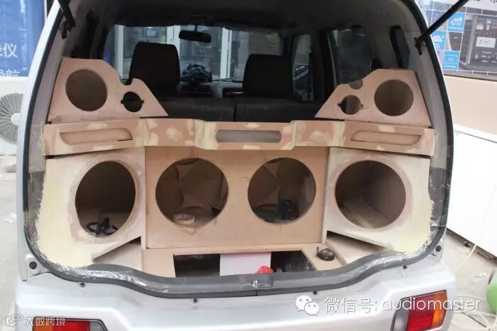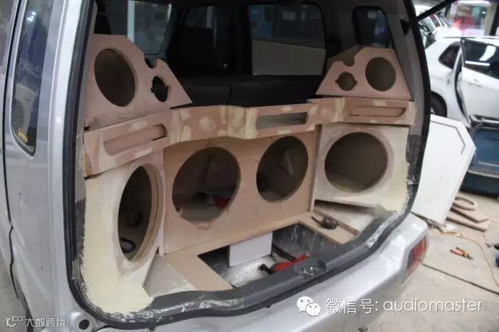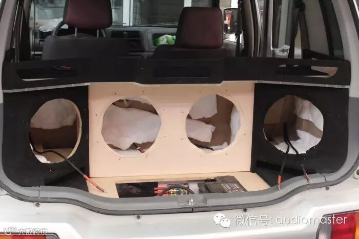 尾箱改装完成,豪客MC124 四只超低音一字排开,豪客MC6.2套装喇叭和豪客高音MT1安装在两边