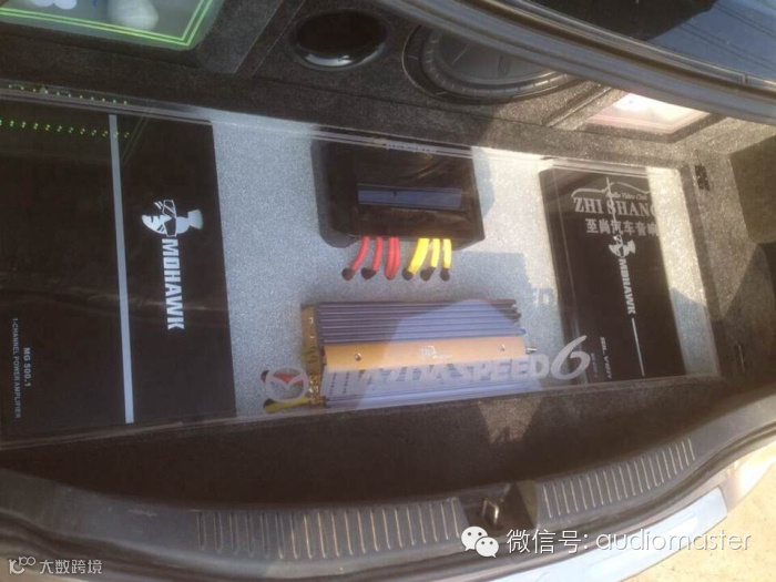 马自达6汽车音响改装!前后声场豪客MC6.2MKIII套装喇叭各一套!前声场功放:豪客MS400.4一台!超低音K牌comp双音圈CWD124一只!低音功放:豪客MG500.1一台!主机:原装进口先锋p910一台!主动两分频!A柱灯光倒膜加尾箱工艺!全车豪客隔音!专业的布线!神一样的效果!夜晚加上七彩灯光的渲染一级骚的尾箱工艺!建阳第一辆此类设计风格!建阳至尚汽车音响秉承客户至上效果第一的理念为所以客户打造最完美的移动音乐厅!