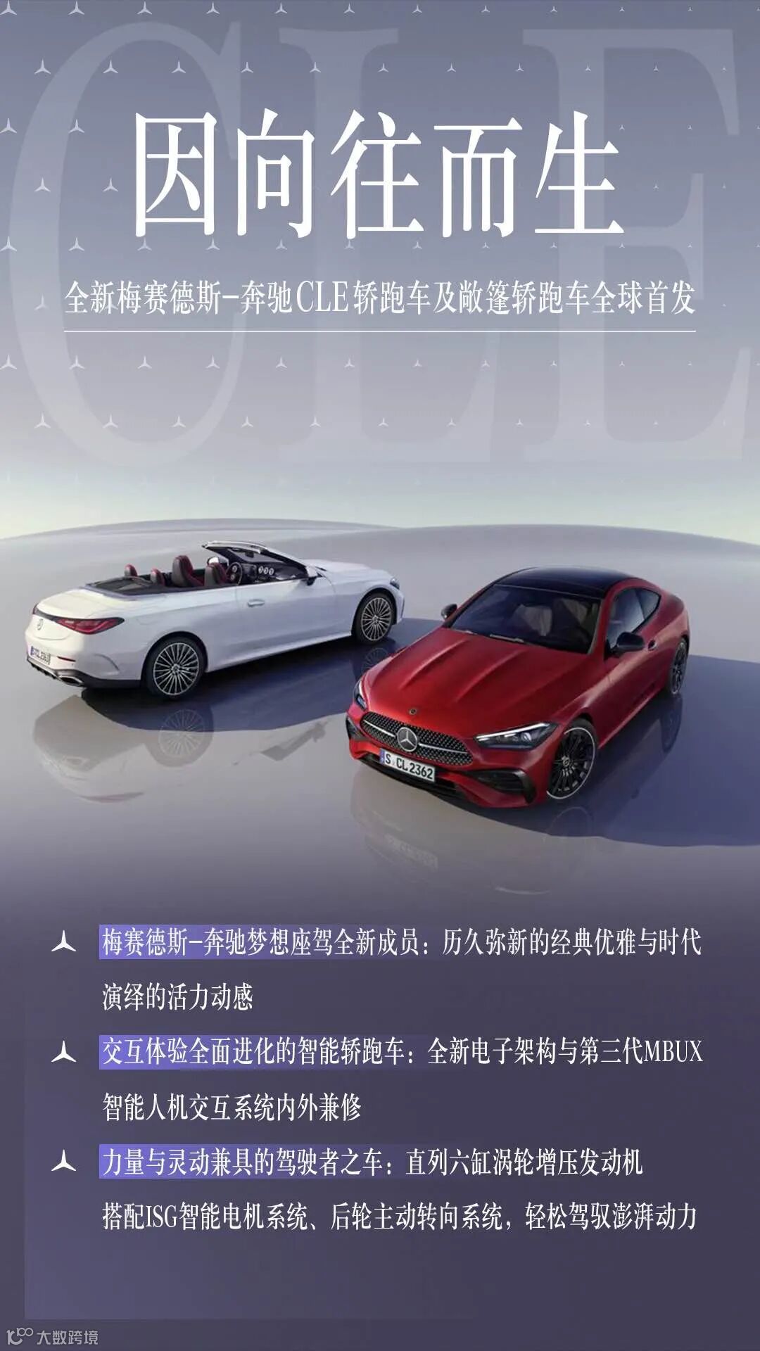 2023年7月5日,梅赛德斯-奔驰全新梦想座驾——全新梅赛德斯-奔驰CLE轿跑车及敞篷轿跑车迎来全球首发。全新CLE轿跑车及敞篷轿跑车承袭梦想车家族基因,以兼具力量与美学的设计,为经典注入全新活力;通过源自全新E级车的第三代MBUX智能人机交互系统等前瞻科技,实现耳目一新的智能体验;全系标配48伏ISG智能电机系统,令驾驶更酣畅淋漓,后轮主动转向系统、动态车身控制系统等驾控科技,令操控更随心所欲,带来超越期待的驾驶乐趣。