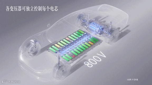 面向未来,梅赛德斯-奔驰的答案是为每个电芯配备单独的可编程变压器,形成并联架构,电芯从“手拉手”的串联模式变为“各自为战”的并联模式,通过电芯级控制提高电池效率,让所有电芯直接为整个电池组做出贡献。由多个微型变压器组成的创新变压器,可直接连接到任意数量的电池组中。这种创新变压器可以单独调节每个电芯单元,以及控制输出电压水平。目前的研究结果表明,无论单个电芯的充电状态(SoC)和健康状态(SoH)如何,每一个可编程变压器均可以在电芯层面直接将电压转换为800伏的稳定电压。