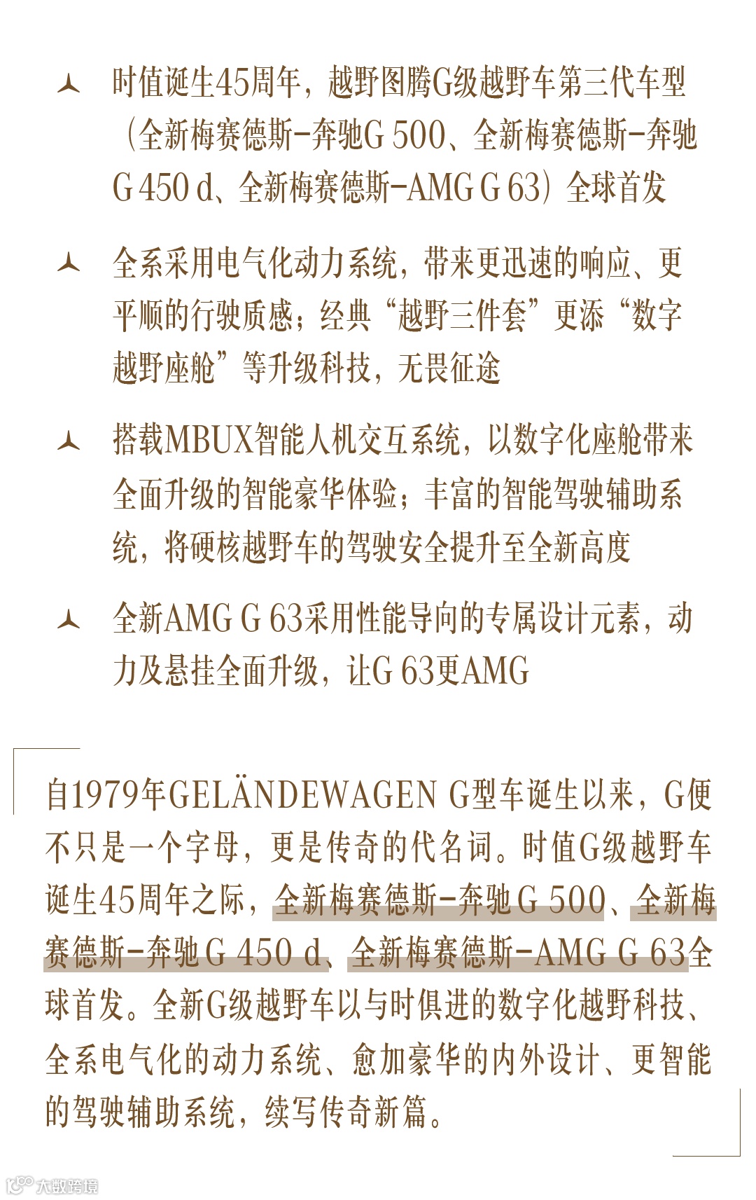 任时光荏苒,唯传奇永恒。历45载而传奇依旧,G级越野车早已化身硬派越野乃至汽车领域的经典ICON。全新G级越野车忠于自我,为车迷呈现真正的“大G”风范,又以与时俱进的进取精神,将豪华和智能安全集于一身。