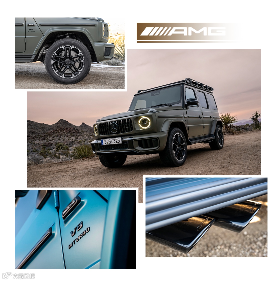 独一无二的AMG专属设计元素,造就全新AMG G 63凌厉尽显的峥嵘风范。全新设计的前包围焕新采用不锈钢材质的纵向饰件,搭配AMG家族垂瀑式进气格栅,打造出极富冲击力的前脸造型。首次闪耀在G级车引擎盖上的AMG家族徽章,与银色镀铬油箱盖上的“AMG”字样和外后视镜的AMG徽章投影交相辉映,一展阿法特巴赫的纯粹基因。此外,碳纤维组件、大尺寸AMG轮毂、车内带AMG操控单元的AMG高性能方向盘等元素,无不昭示其AMG家族的不俗身份,时刻挑动车主追求极致驾驭的热血激情。